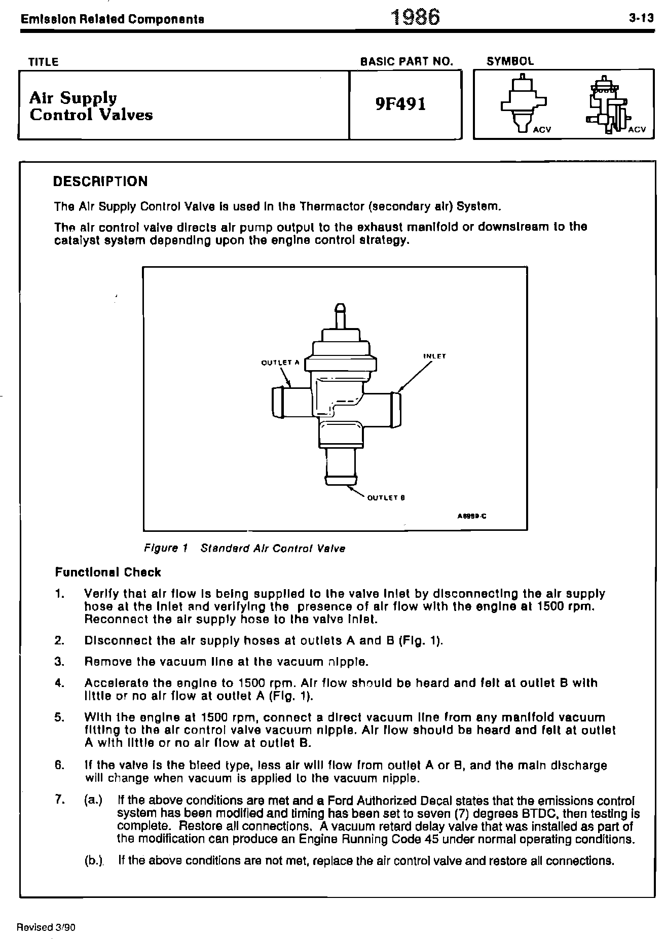 ISSUE: The Functional Check procedure for Air Supply Control Valves shown on page 3-13 of the 1986 Engine Emissions Diagnosis Shop Manual has been revised. Due to a modification of the air management system by the addition of a vacuum retard delay valve, an Engine Running Code 45 may be displayed during Self-Test.