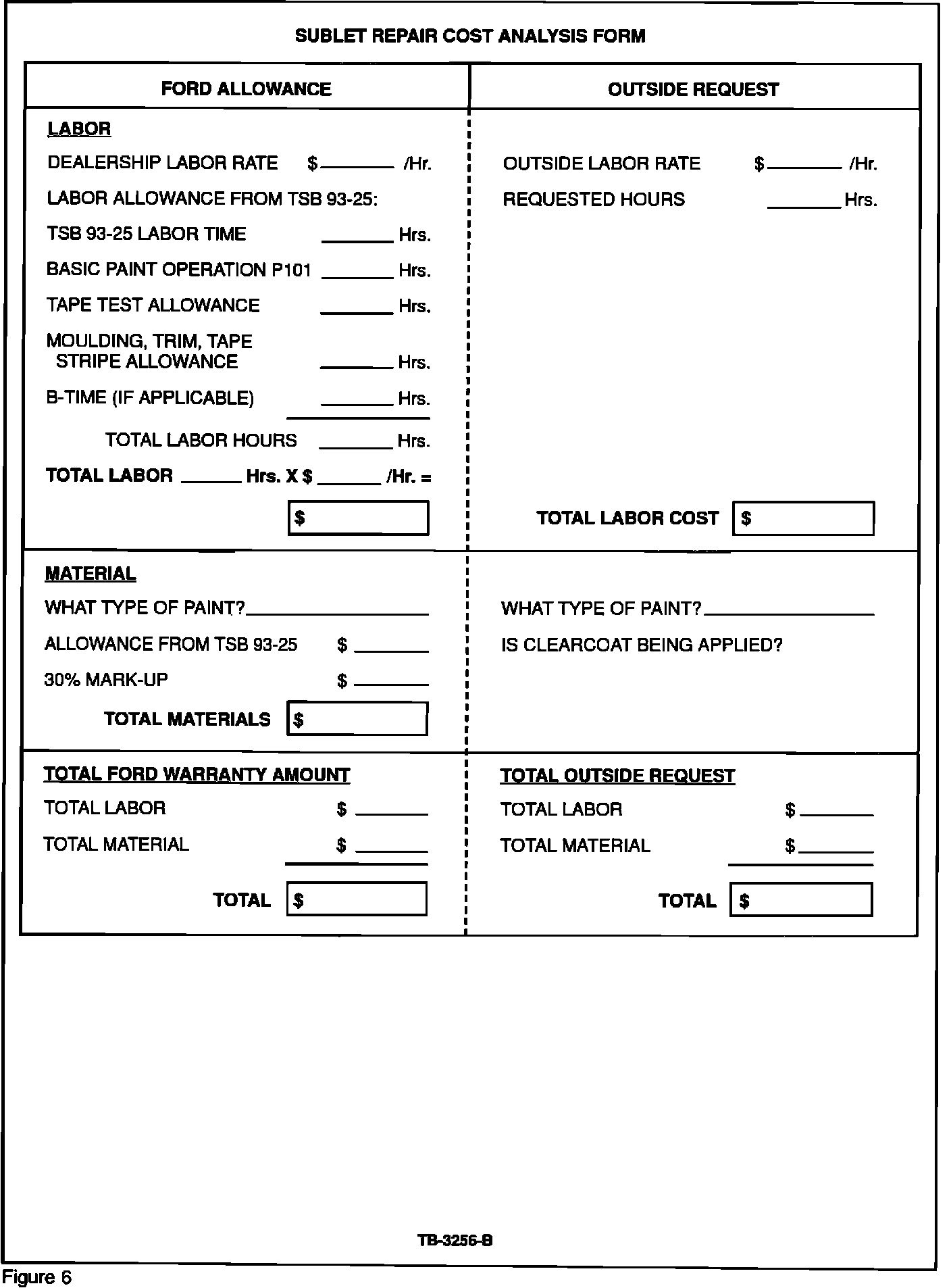 If the cost of the sublet repair is excessive and the dealer cannot resolve the issue with the outside body shop, the Sublet Repair Cost Analysis Form, Figure 6, should be completed by the dealer and faxed to the Customer Assistance Center for review and approval. This form should be attached to the hard copy in the customer's service file and must be retained.