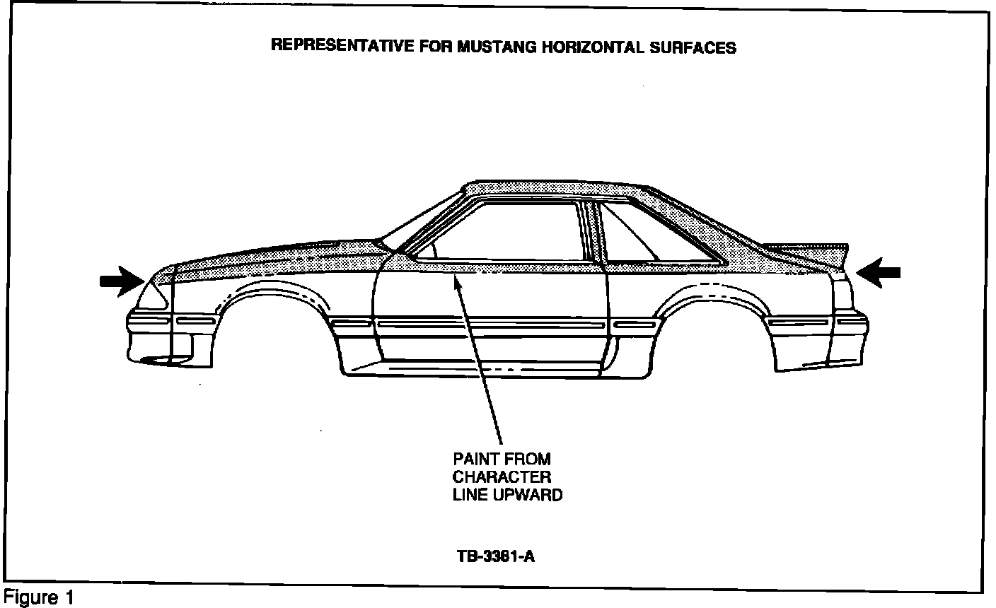 c. If paint was removed during the tape test, above and below the character line, repaint the entire vehicle. If paint was removed only from areas above the character line, repaint only the horizontal surfaces of the vehicle (entire area above the character line), Figure 1.