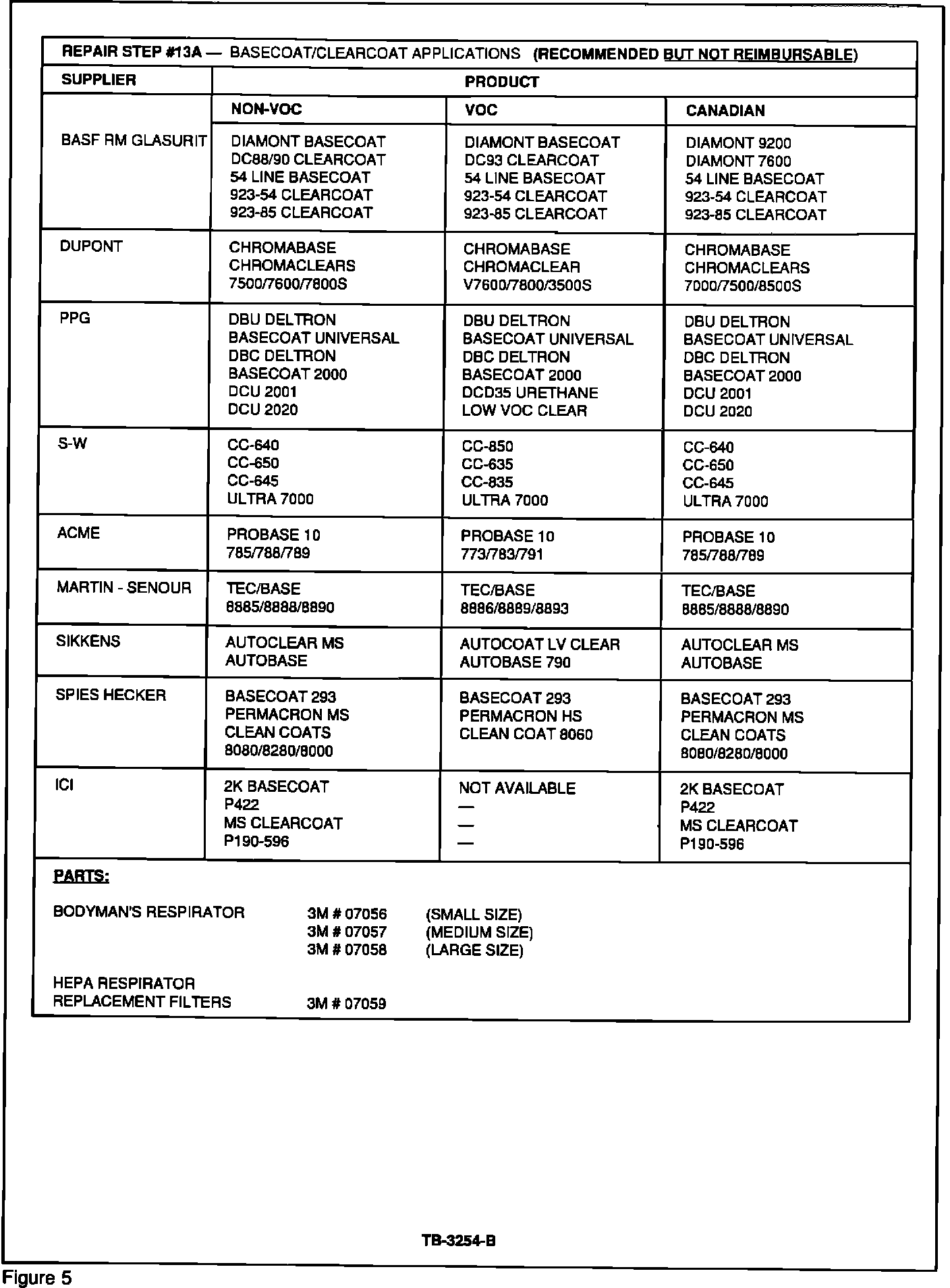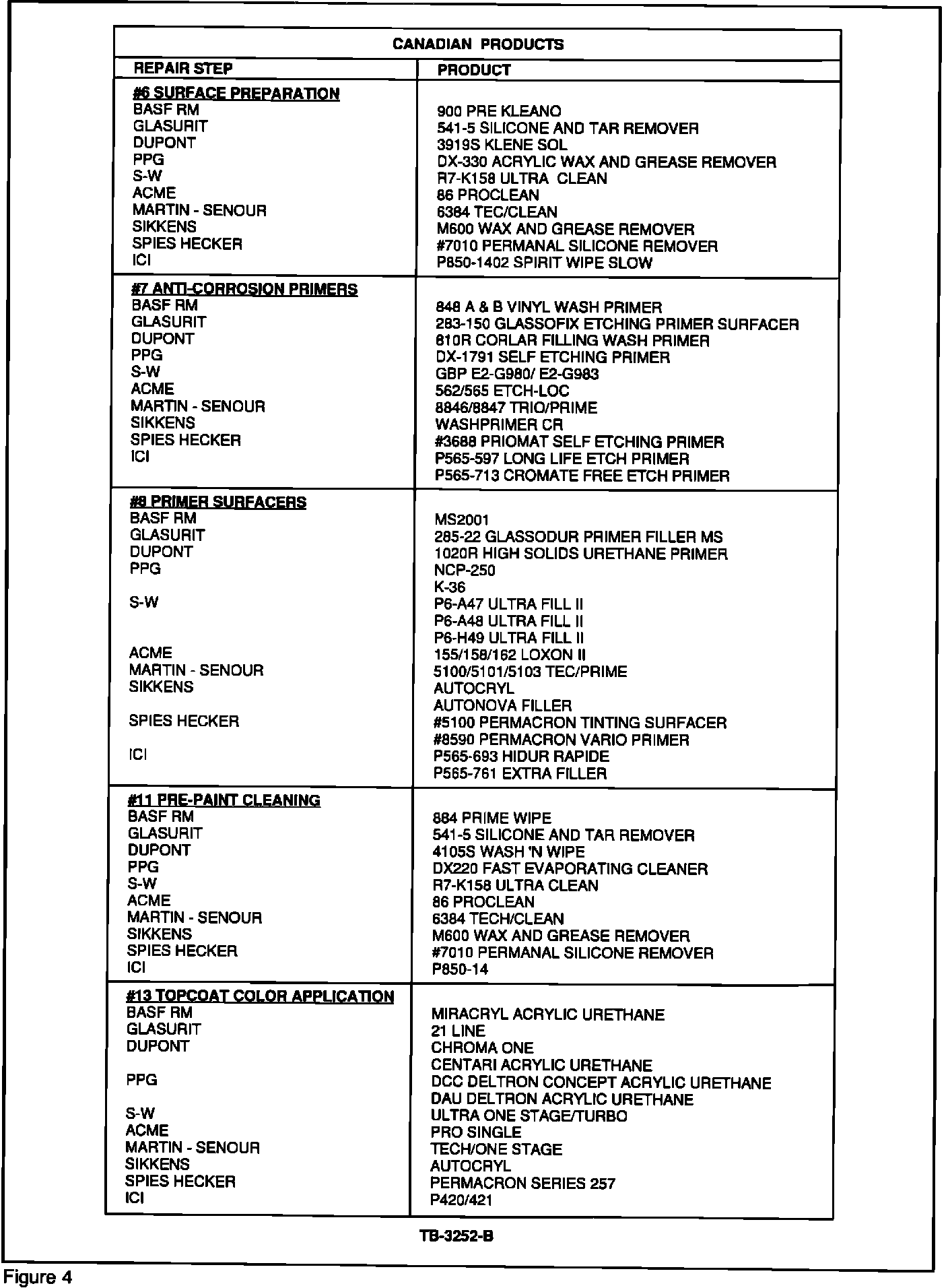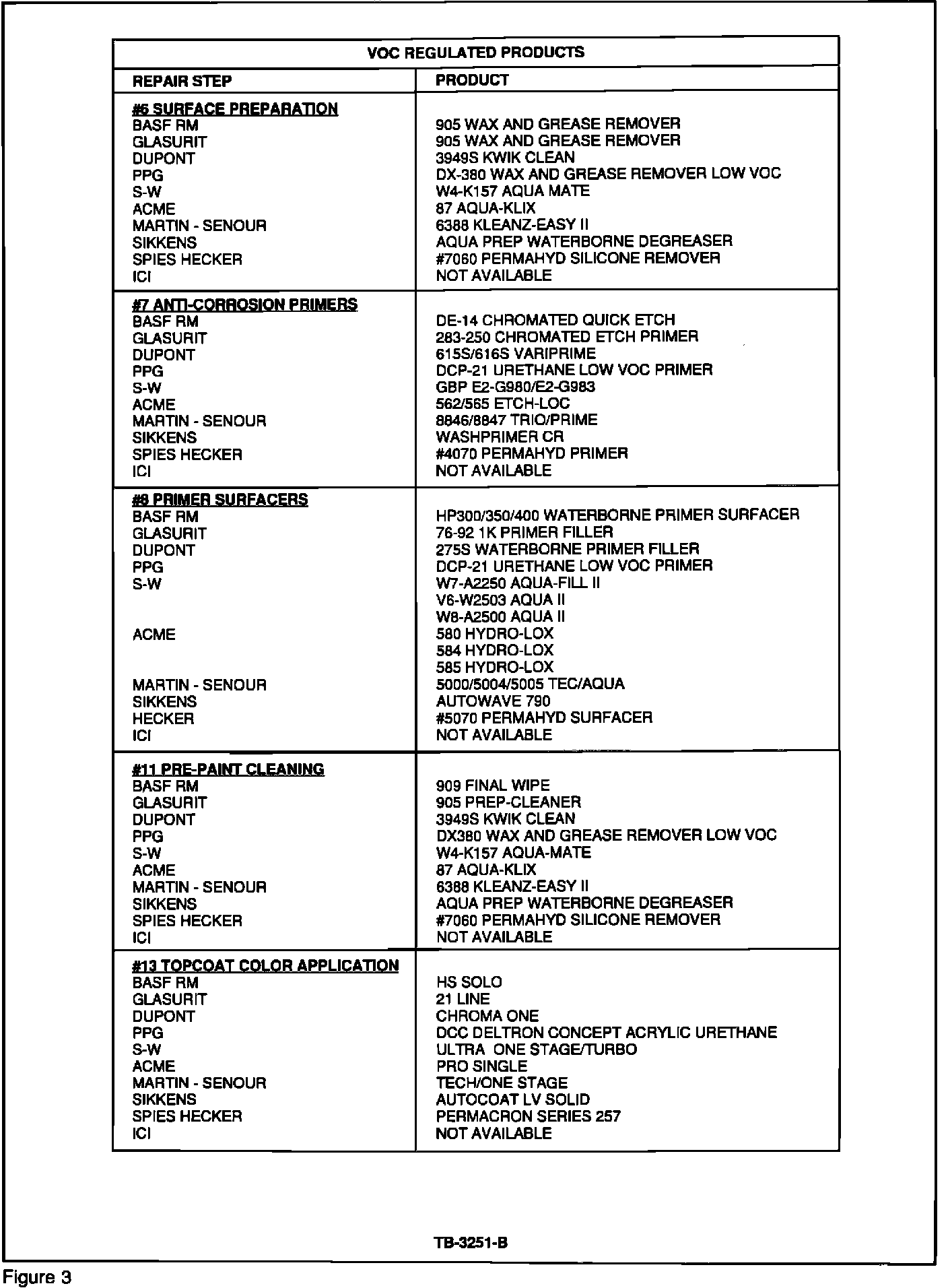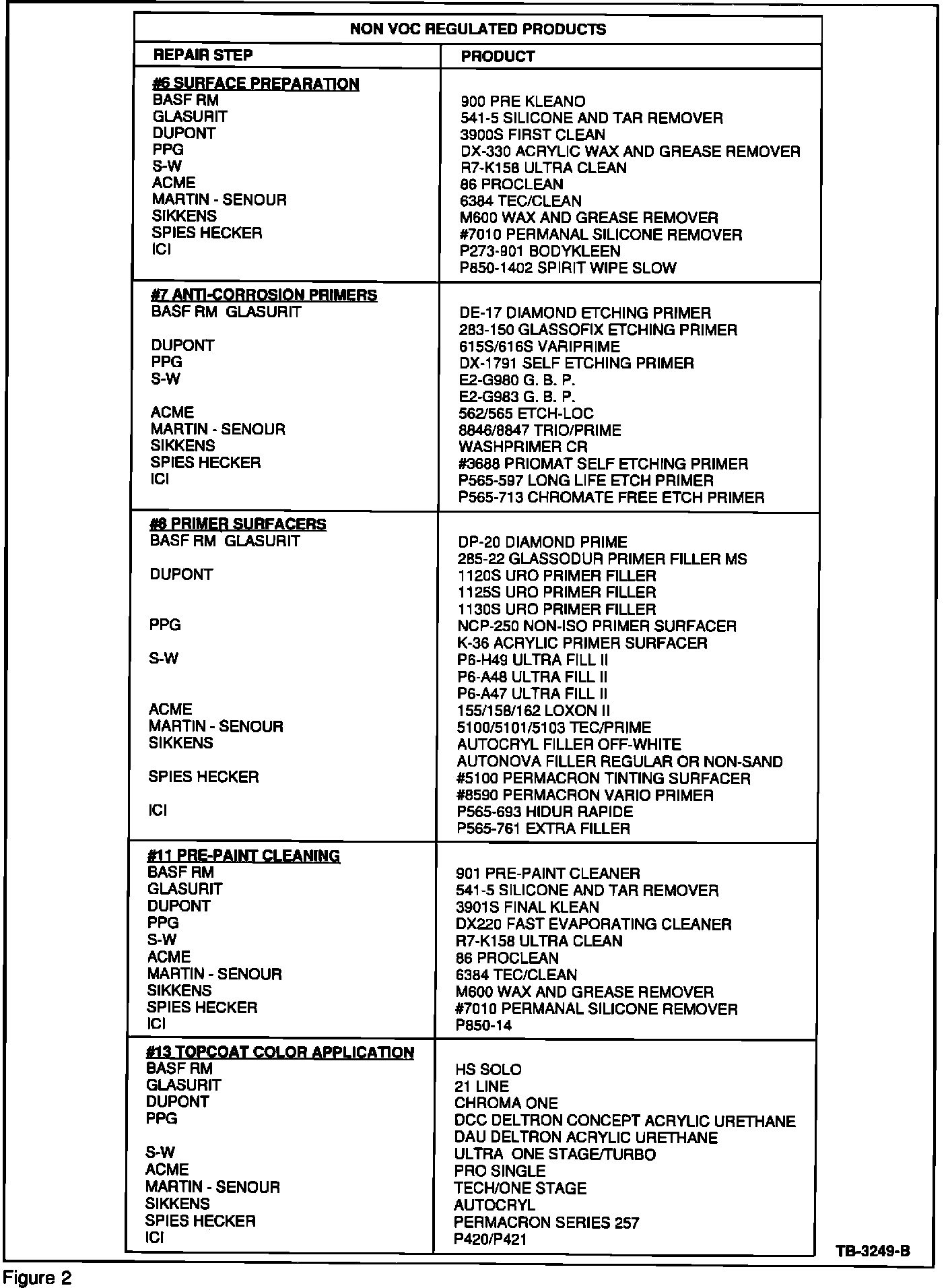 The charts, Figures 2 - 5, contain all ACCEPTABLE products for refinishing Mustang vehicles in the Owner Dialogue Program. Acceptable materials are separated into Non-VOC Regulated, VOC Regulated, and Canadian Usage. Any product that is not listed in this TSB article MAY NOT BE USED!