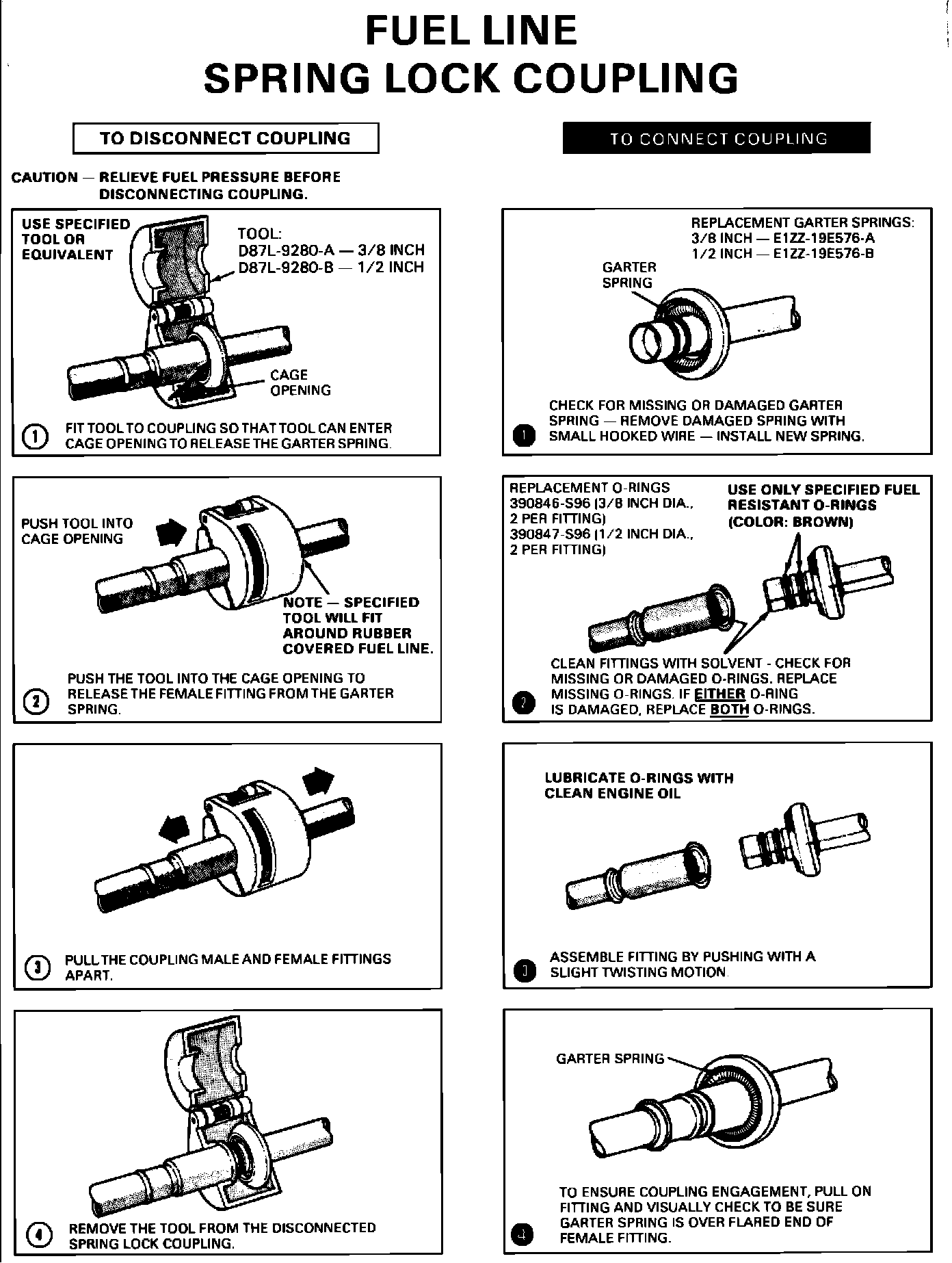 In addition, the service tools and service part O-rings have been recently revised. The service tools (available March, 1987) D87L-9280-A (3/8") and D87L-9280-B (1/2") used to disconnect the spring lock coupling will now fit around the rubber cover on the fuel line allowing an easier disconnect. The O-ring part numbers were changed to specify color. The fuel resistant O-rings 390846-S96 (3/8") and 390847-S96 (1/2") will be BROWN in color while the A/C refrigerant Orings will continue to be BLACK.