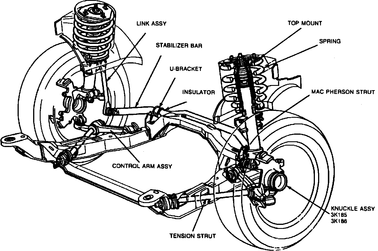 This suspension is of the gas filled MacPherson strut type, Fig. 1. The strut top mount consists of a rubber insulated bearing and seat and coil spring insulator. The top mount is attached to the body side apron by three bolts. The lower part of the strut is mounted in the steering knuckle and is retained by a pinch bolt. A forged lower control arm is attached to the sub-frame and to the steering knuckle. A tension strut is connected to the lower control arm and to the forward part of the sub-frame.