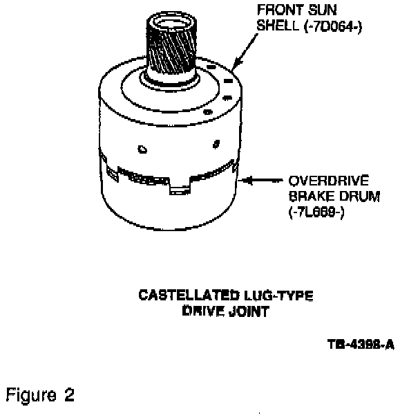 If a castellated lug drive joint overdrive drum, front sun and shell assembly and/or direct one-way clutch inner race and plate assembly is being replaced by a "Grob"-type drive joint, the mating parts must also be replaced as a set.