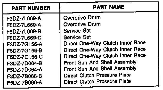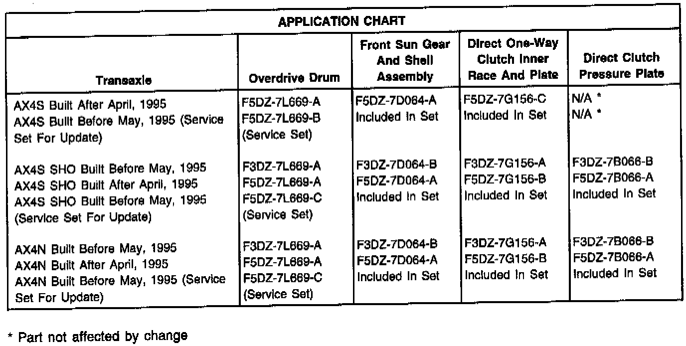 All three (3) mating parts are available as a past model service set for the AXOD, AXODE, and AX4S transaxles (except Taurus SHO). Refer to the following text and Application Chart for details.