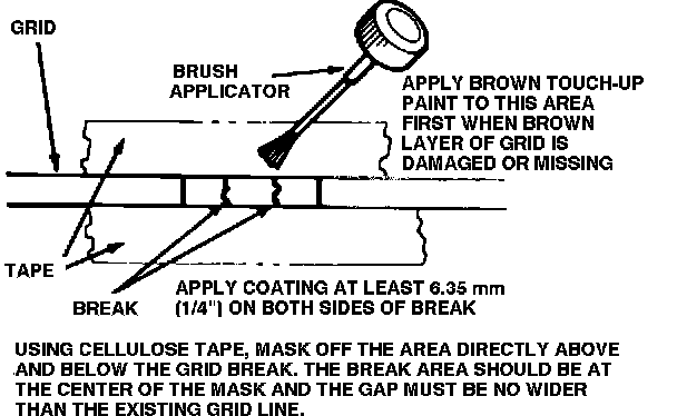 3. Apply the repair coating in several smooth continuous strokes (allowing three to five minutes drying time between coats) across the break area using the brush applicator in the cap. Extend the service coating at least 6.35 mm (1/4 inch) on both sides of the break area. If both brown and silver layers of the grid are broken or missing, apply a coating of the brown touch-up paint across the break area first. Two coats may be necessary to obtain the proper color. Allow the touch-up paint to dry, then apply three coats of silver grid repair compound allowing three to five minutes drying time between coats. The coating of the silver grid repair compound should extend at least 6.35 mm (1/4 inch) on both sides of the break area.