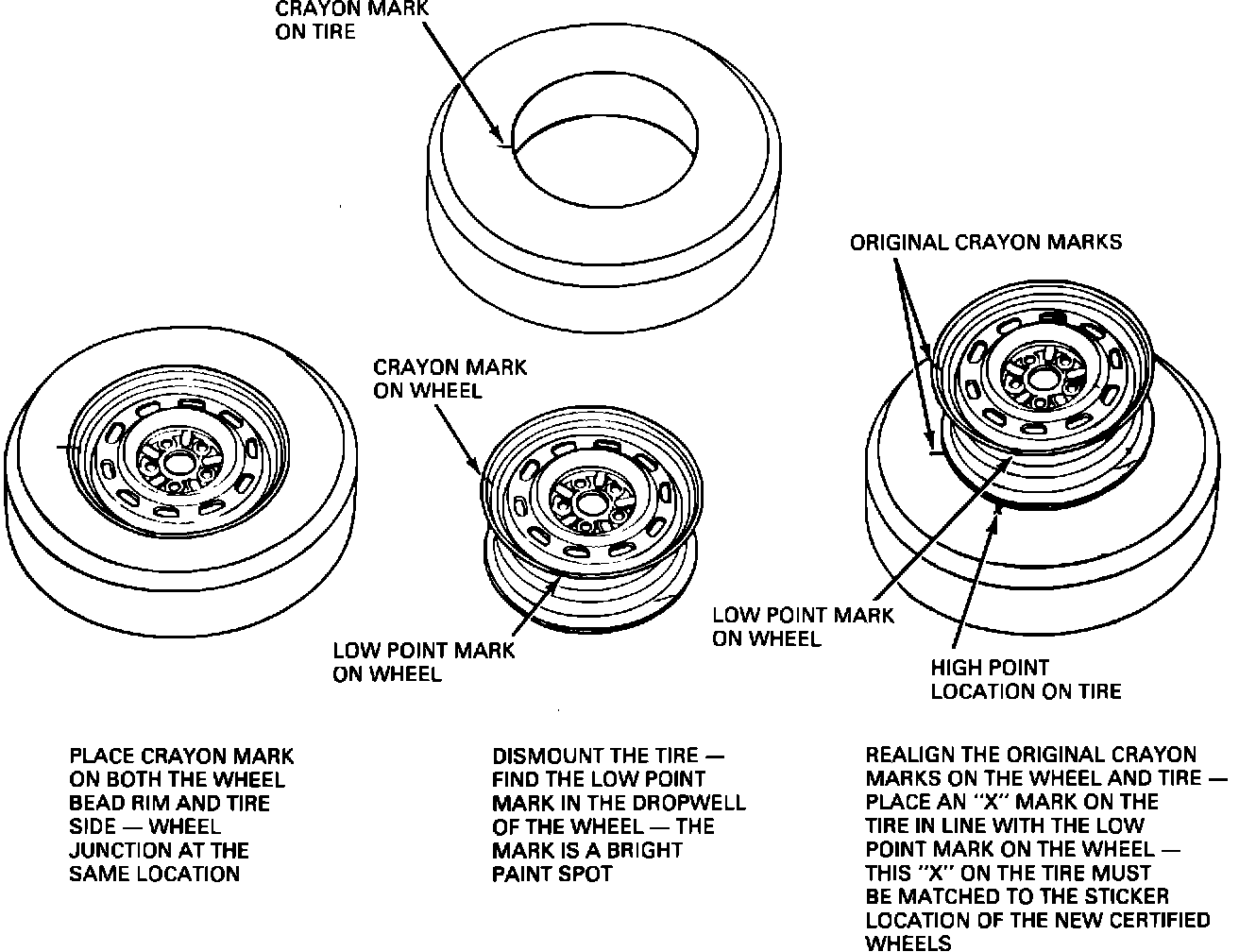 Prior to dismounting the tire, the wheel should be checked for radial runout low point sticker and location. The sticker is yellow green in color and is located on the bead seat flange of the wheel. If this is found on the wheel, mark the tire bead directly across from sticker with a crayon. This is the high point location of the tire runout. This high point location mark on the tire should be matched to the low point sticker location on the new certified wheel assemblies, when mounting the tires. If the wheel does not have a low point sticker, the following should be used to determine the tire/wheel index marks.
