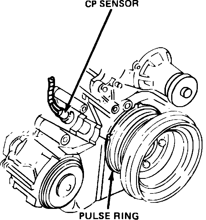 The crankshaft position sensor and pulse ring assembly, transmits signals according to crankshaft position. The pulse ring, Fig. 4, is pressed onto the vibration damper.