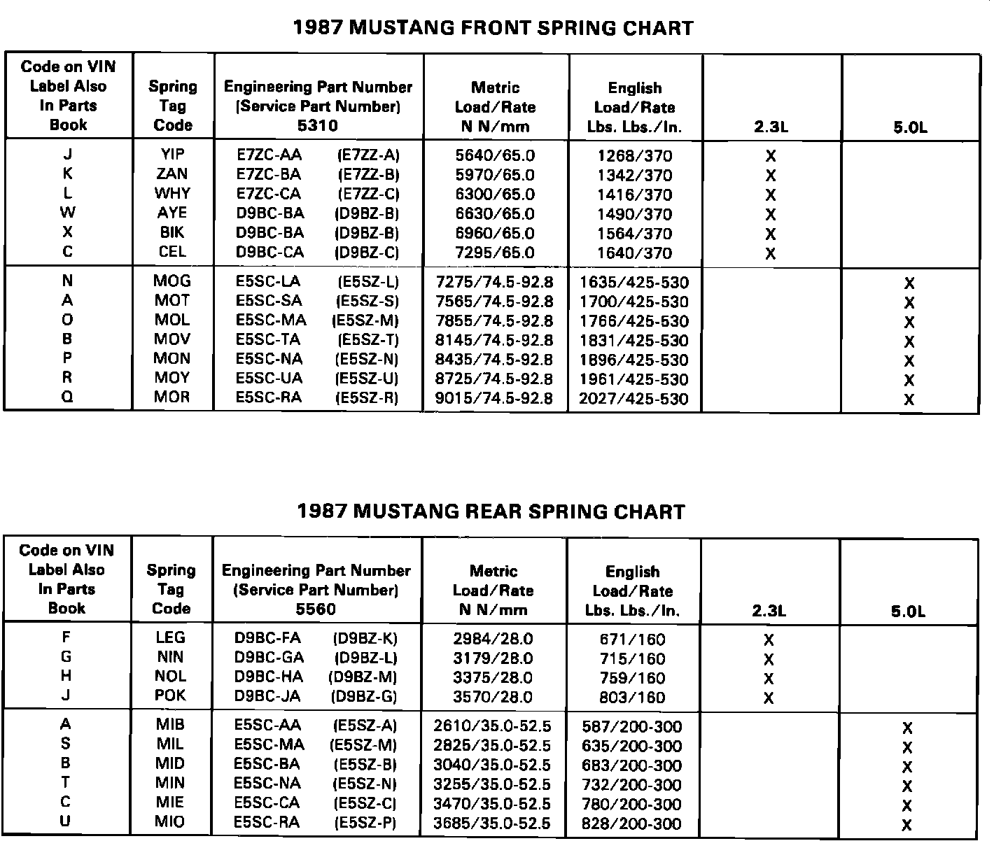 1987 Mustang Spring Charts