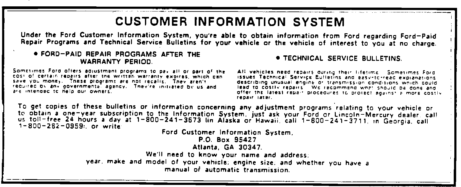 Included with this letter you will find the Ford Customer Information announcement. This system provides information on programs such as the program described in this letter and other information that may be of interest to you.