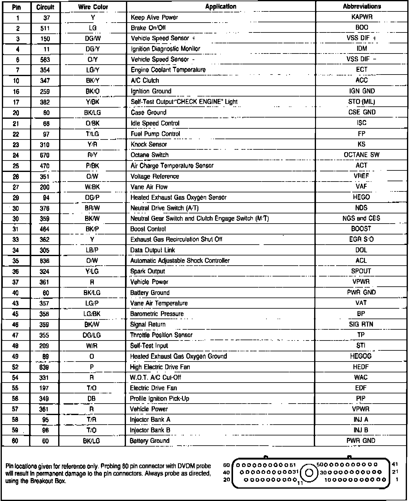 Fig. 300 EEC-IV module connector pin usage. 1987 4-140 EFI turbocharged engine: