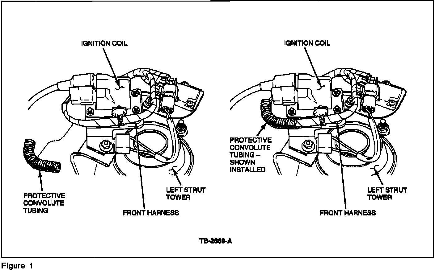 3. Attach the protector (corrugated tube), also contained in Kit (F2BZ-14526-A), to the wiring harness going to the ignition coil as shown in Figure 1.