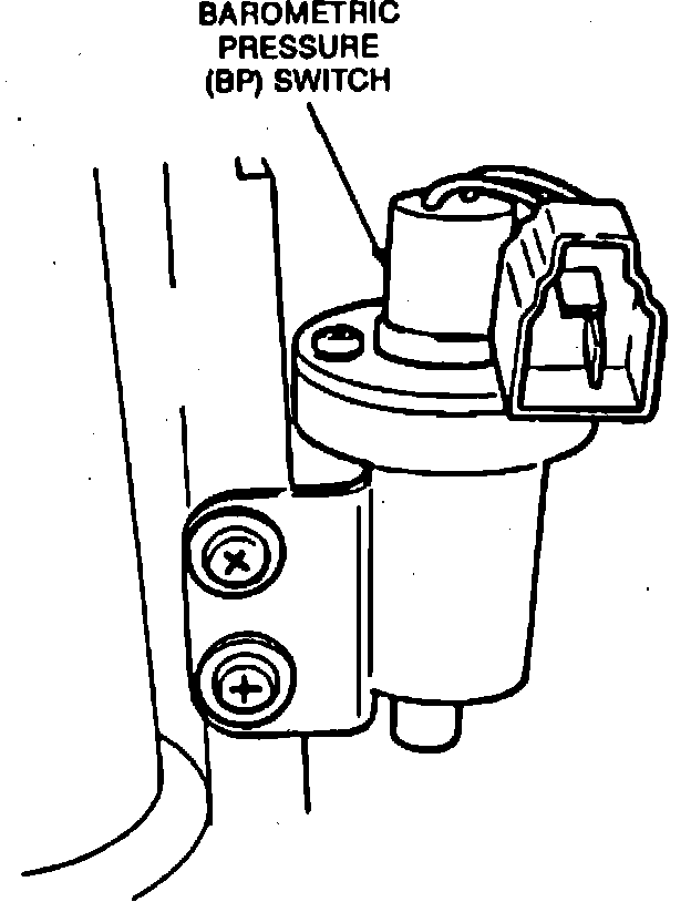 The barometric pressure (BP) switch, Fig. 2, is turned on when a decrease in atmospheric pressure occurs. The ECA will then compensate for the altitude the vehicle is operating at. The ECA uses this information to control ignition timing, air/fuel ratio, EGR flow and the shift indicator light. The BP switch is located under the instrument panel at the lefthand of the steering column assembly.