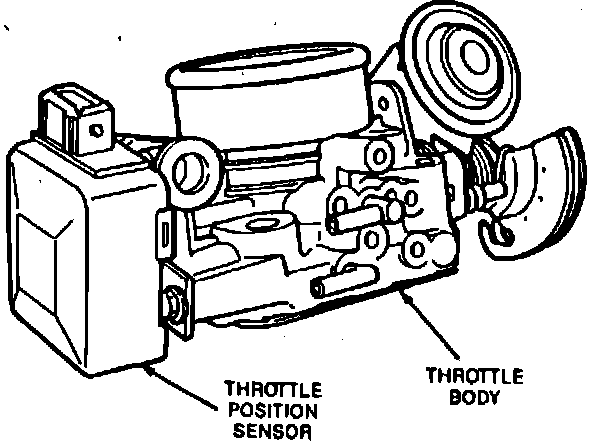 The throttle position (TP) sensor, Fig. 12, detects throttle position angle, the sensor consists of two switches that sense either an idle position signal or a wide open throttle signal. These two switches are called the idle (IDL) switch and the wide open throttle (WOT) switch. The information that TP sensor inputs to the ECA is used to affect air/fuel ratio, fuel injection timing, A/C clutch operation, idle speed and purge flow. The TP sensor is located directly above the throttle body assembly.