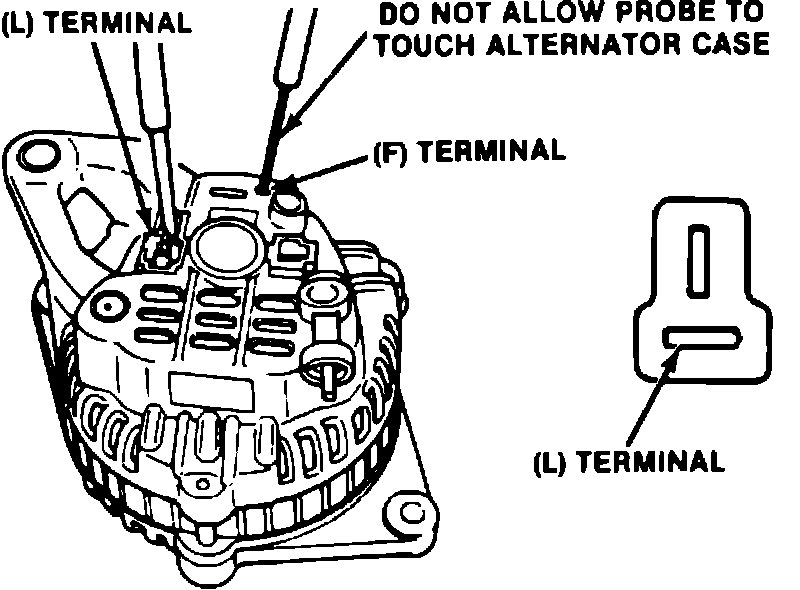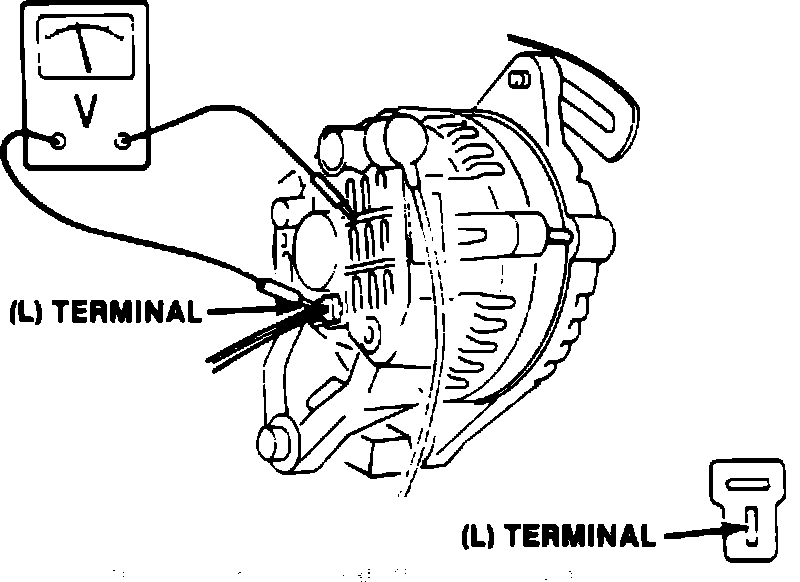 2. With ignition switch On, connect voltmeter positive lead to ``L'' terminal metal connector, and negative lead to alternator case. Read and record reading.