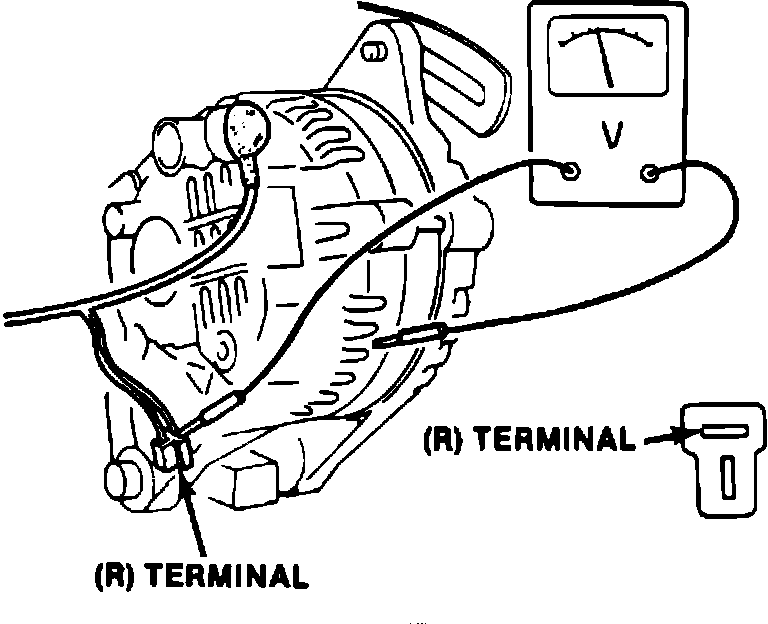 2. Disconnect ``R'' terminal connector from rear of alternator, then connect voltmeter positive lead to ``R'' terminal connector harness and negative lead to alternator case, Fig. 2. Read and record voltage.