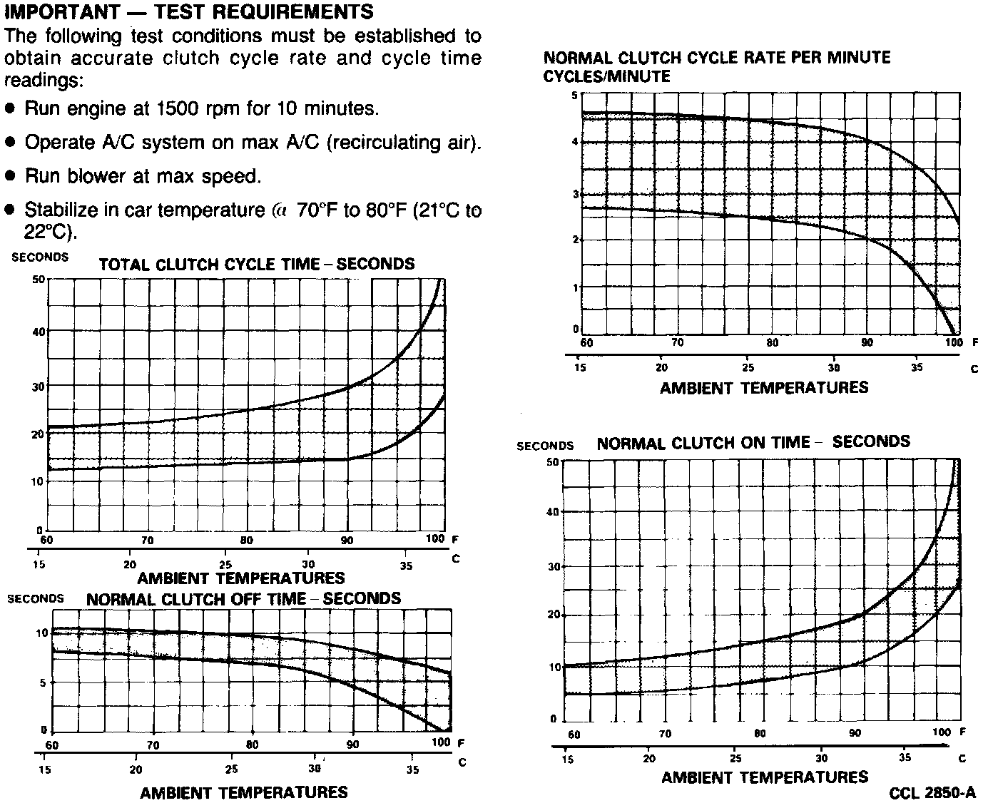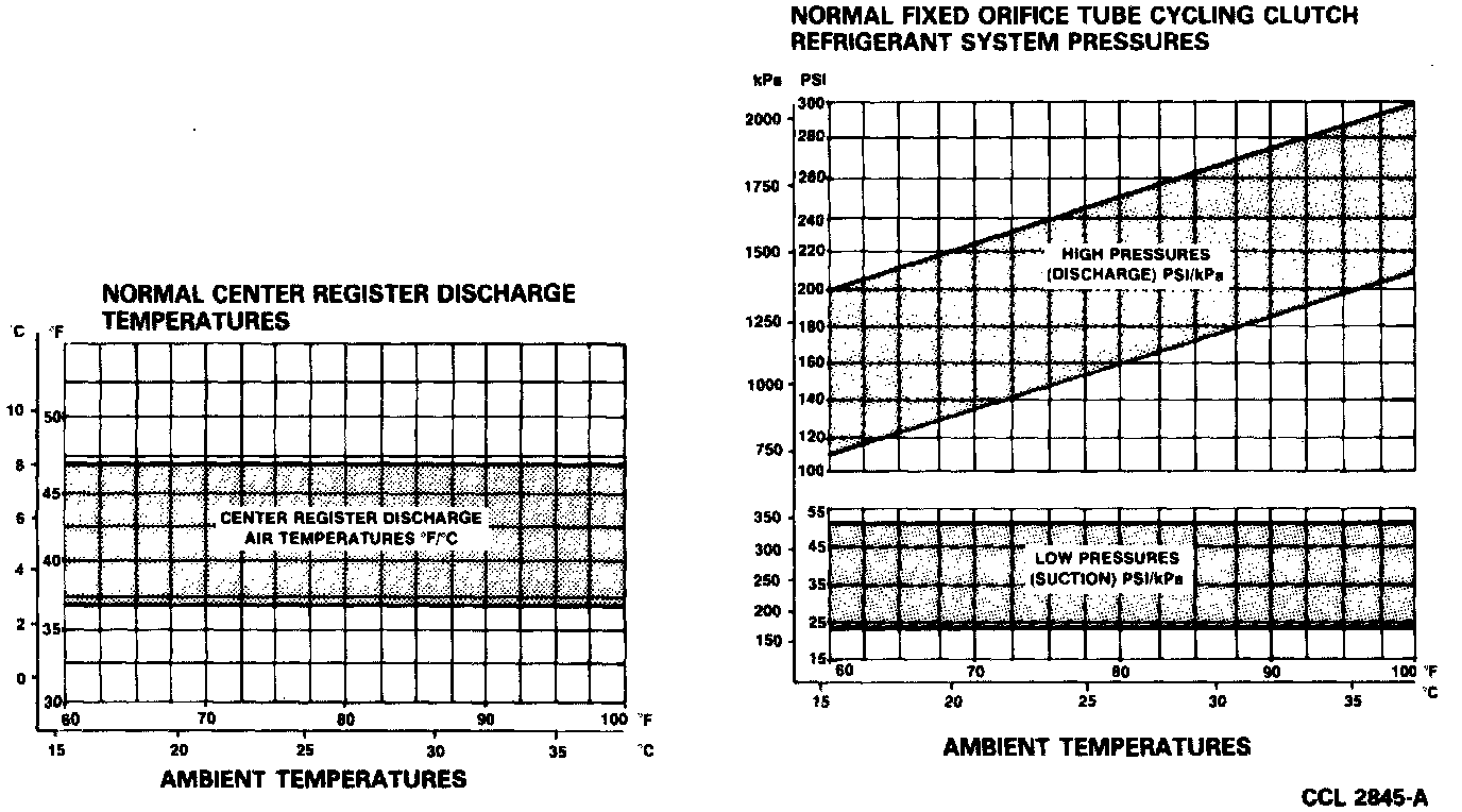 The best way to diagnose a problem in the refrigerant system is to note the system pressures (shown by the manifold gauges), and the clutch cycle rate and times. Then, compare the findings to the charts shown.
