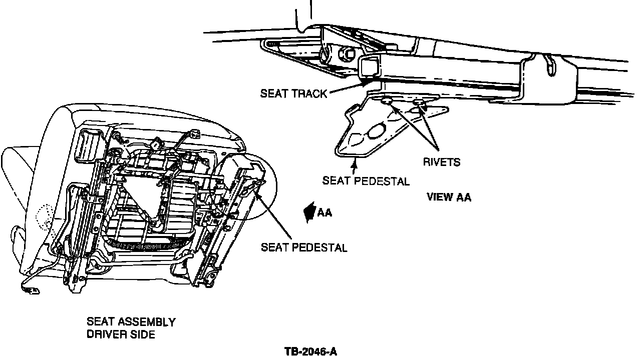 2. Remove the heads of the two rivets retaining the old pedestal to seat track, Figure 1.