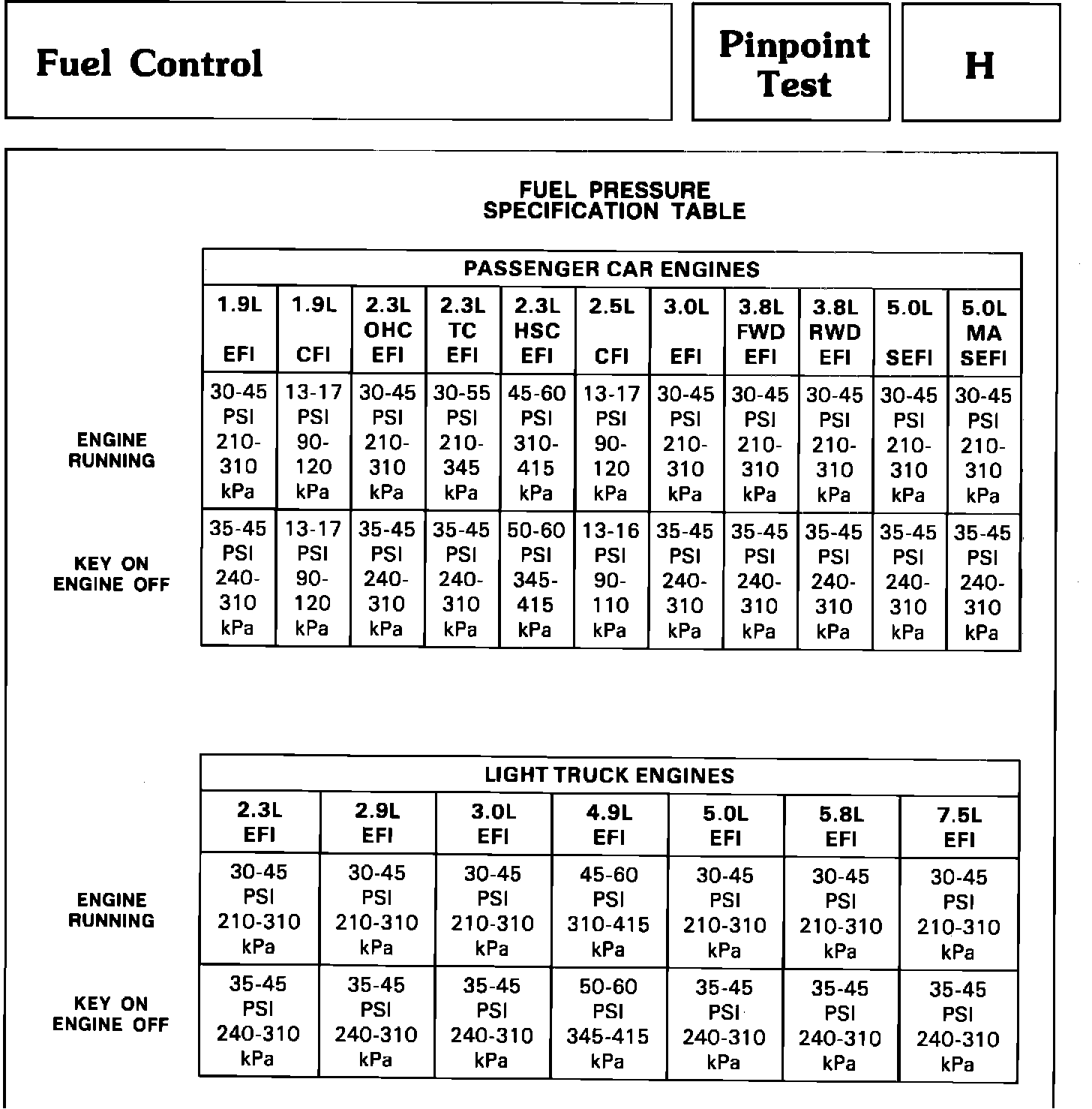 ISSUE: The fuel pressure specification ranges for some engine applications are incorrect as published in the 1988 Engine/Emission Diagnosis Manual, Pinpoint Test "H", Section 19, Page 130.