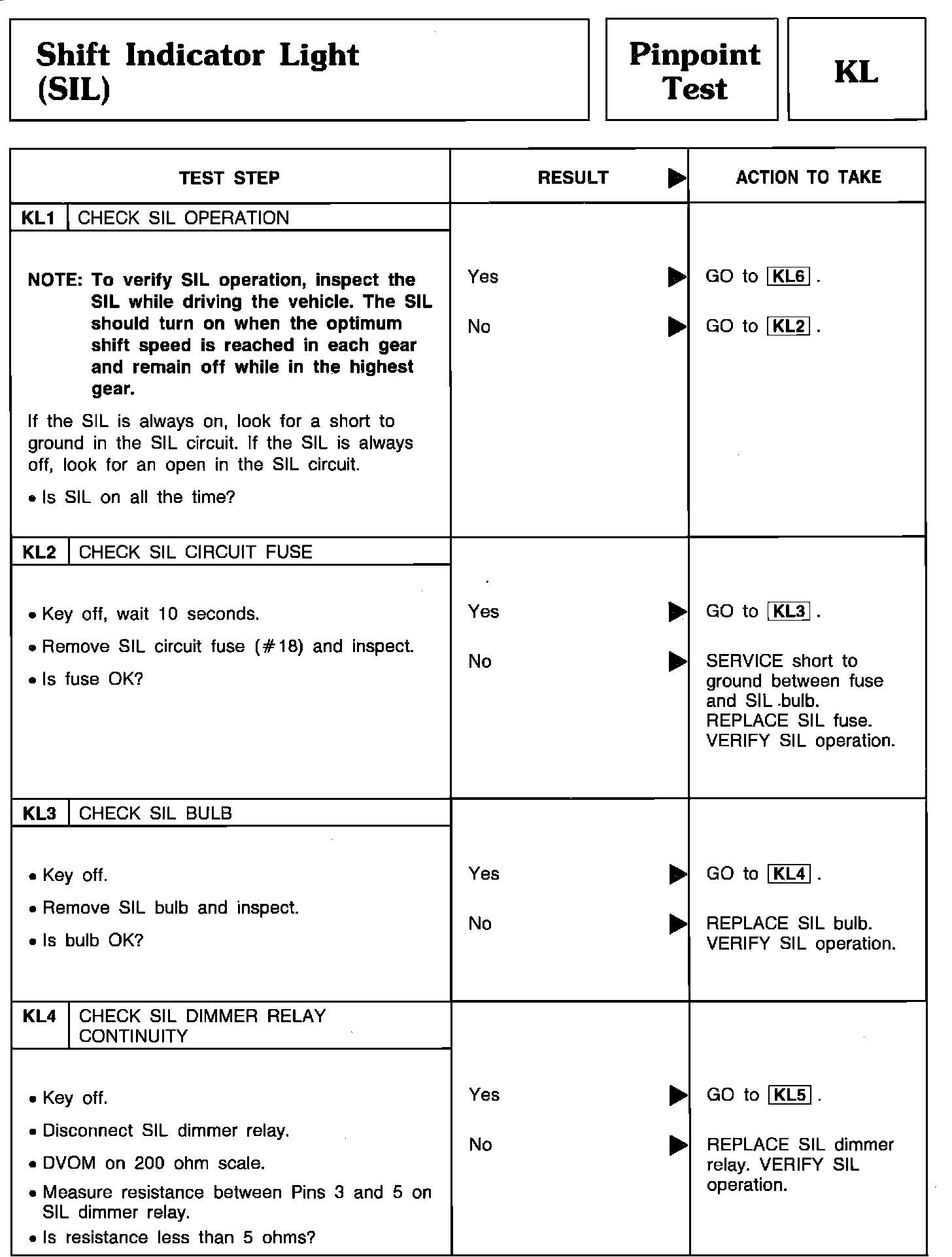 Pinpoint Test KL1 Thru KL4 - Shift Indicator Light (SIL):