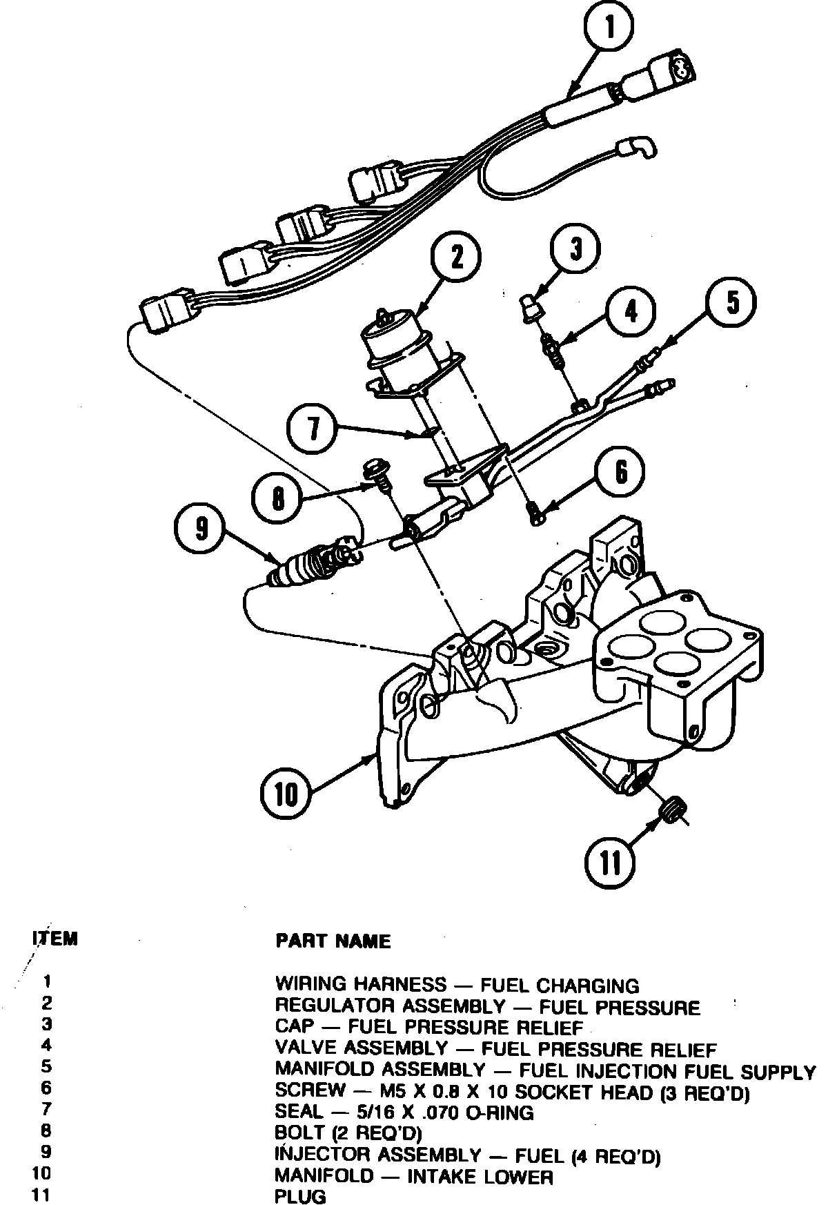 The fuel charging manifold assembly, houses the injectors which are mounted directly above each of the engine's intake ports. When energized, the injectors spray a metered quantity of fuel into the intake air stream.
