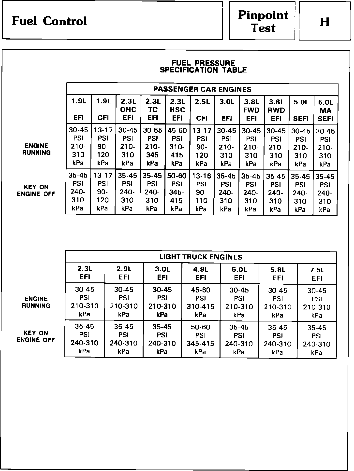 H - Fuel Pressure Specification Table