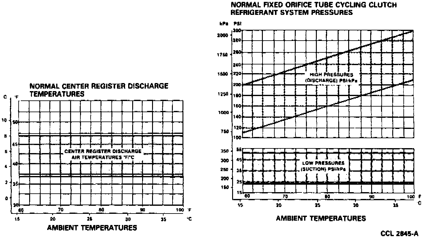 The best way to diagnose a problem in the refrigerant system is to note the system pressures (shown by the manifold gauges), and the clutch cycle rate and times. Then, compare the findings to the charts.