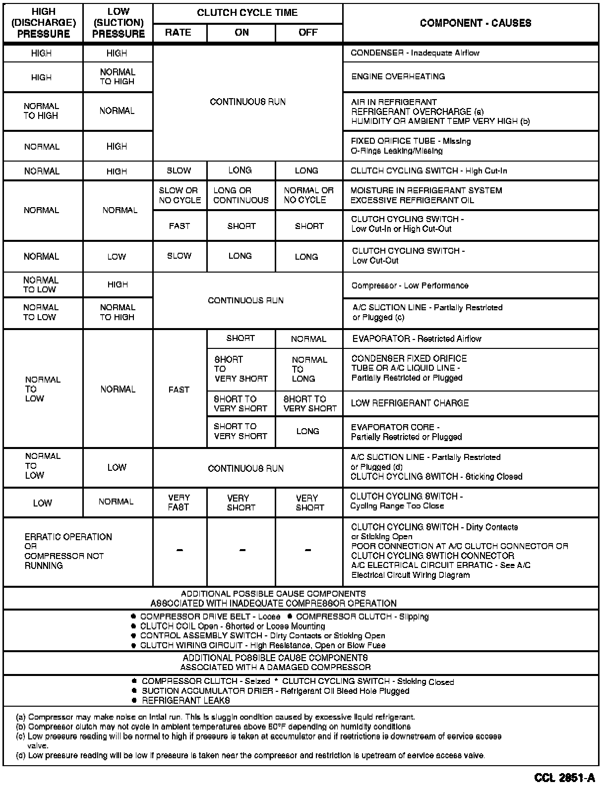 At the bottom of the chart, additional cause components are listed for poor compressor operation or a damaged compressor condition.