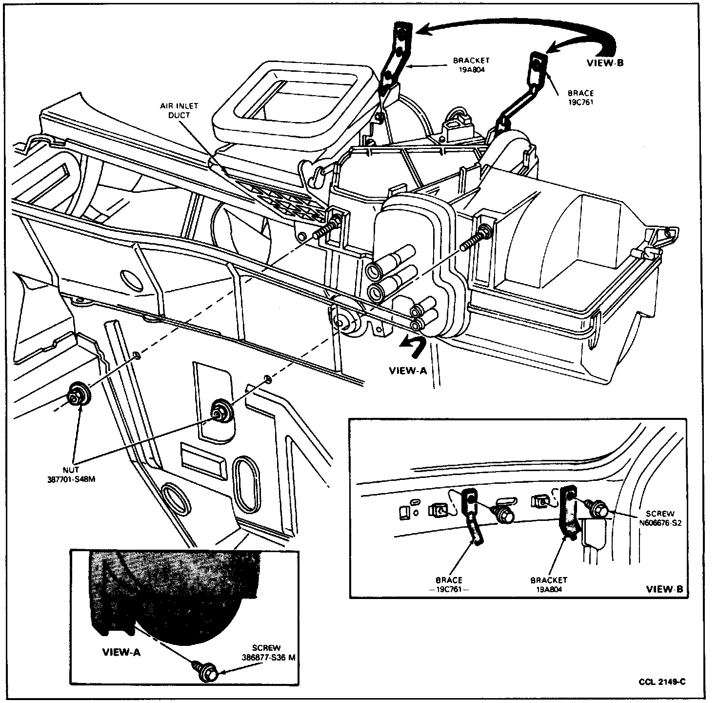 1. Position the evaporator case assembly to the dash panel and the cowl top panel at the air inlet opening. Install the two screws to attach the support bracket and brace to the cowl top panel (see illustration).