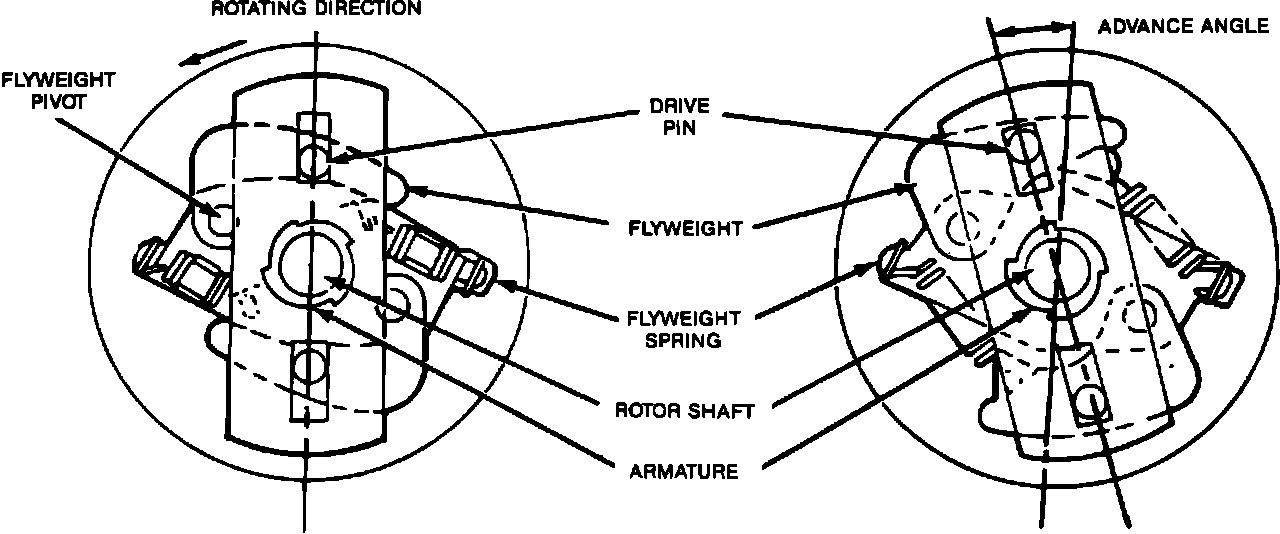 Centrifugal advance of spark timing, with increasing engine speed, is achieved by rotation of the rotor and armature shaft in relation to the distributor shaft. The rotor shaft is driven by the distributor shaft. The two are connected through centrifugal flyweights, pivoted on a plate which is an integral part of the distributor shaft. Drive pins on the flyweights engage slots in a plate at the base of the rotor shaft. Springs pull the flyweights in toward shaft center when at rest and at low speed, holding the rotor shaft in the base timing or full-retard position. As engine speed increases, centrifugal force causes the weights to pull outward against the springs. At 1050 rpm they begin moving the rotor shaft in the advance direction.