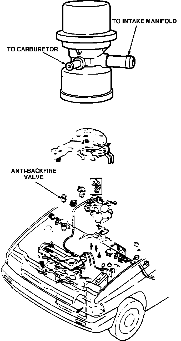 The Pulse Air Control Valve consists of a vacuum diaphragm that when subjected to manifold vacuum, opens a passage between the air cleaner and exhaust manifold allowing the reed valves to inject secondary air into the exhaust flow. Vacuum to the pulse air control valve is controlled by a control solenoid which opens and closes the vacuum passage upon signals from the Electronic Control Assembly (ECA).
