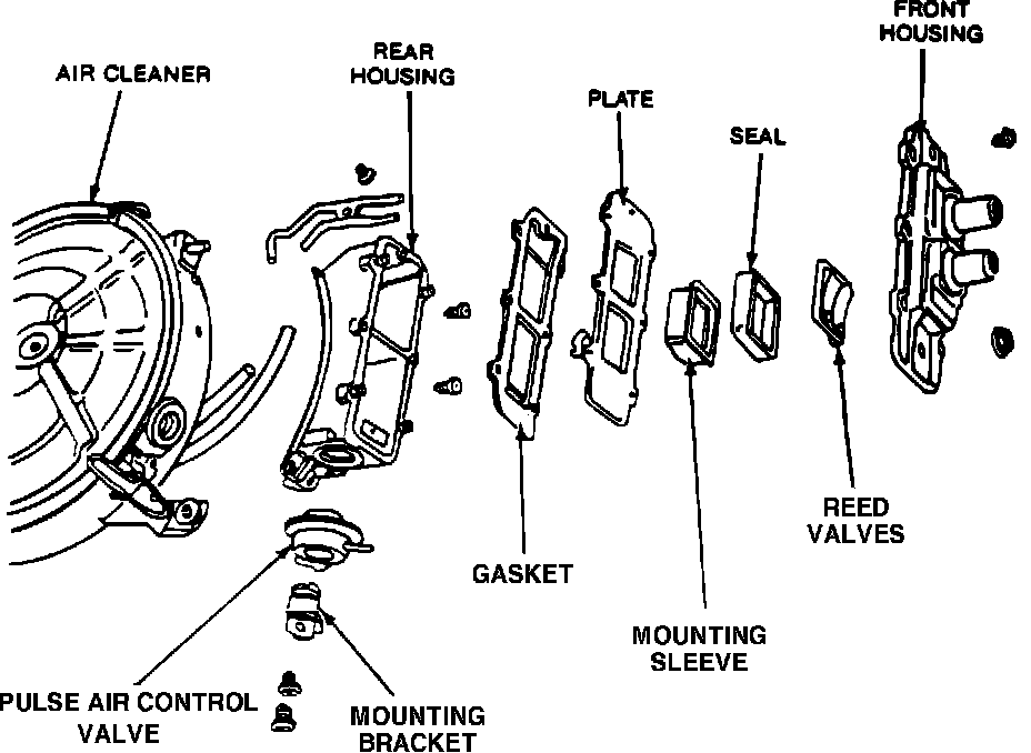 The Reed Valves are one-way valves that close to prevent exhaust gas from flowing into the air cleaner as back pressure becomes positive. Installed in a housing and mounted to the air cleaner, the Reed Valves operate on exhaust pulses to provide air injection to the exhaust manifold and catalytic converter. This action assists in controlling HC and CO emissions.