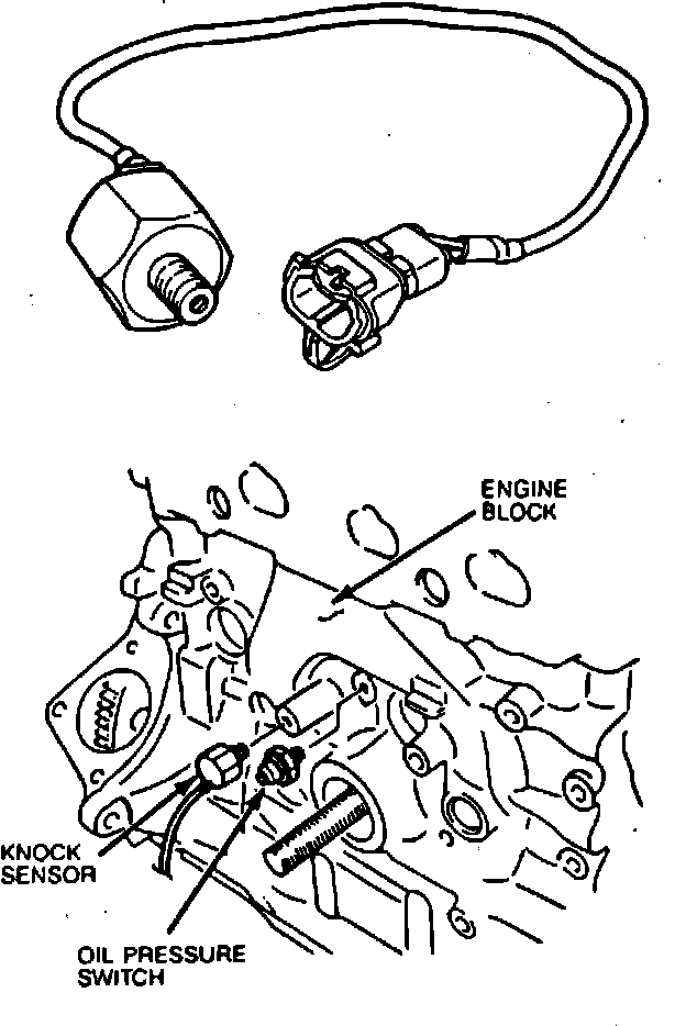 The knock sensor, Fig. 9, is an electronic device capable of measuring vibration and converting the vibration signal to an electrical output that measures the engine knock. The voltage signal generated by the knock sensor is sent to the knock control unit for filtering and then to the electronic control assembly for control of ignition timing. The sensor is threaded in the engine block near the oil pressure switch.