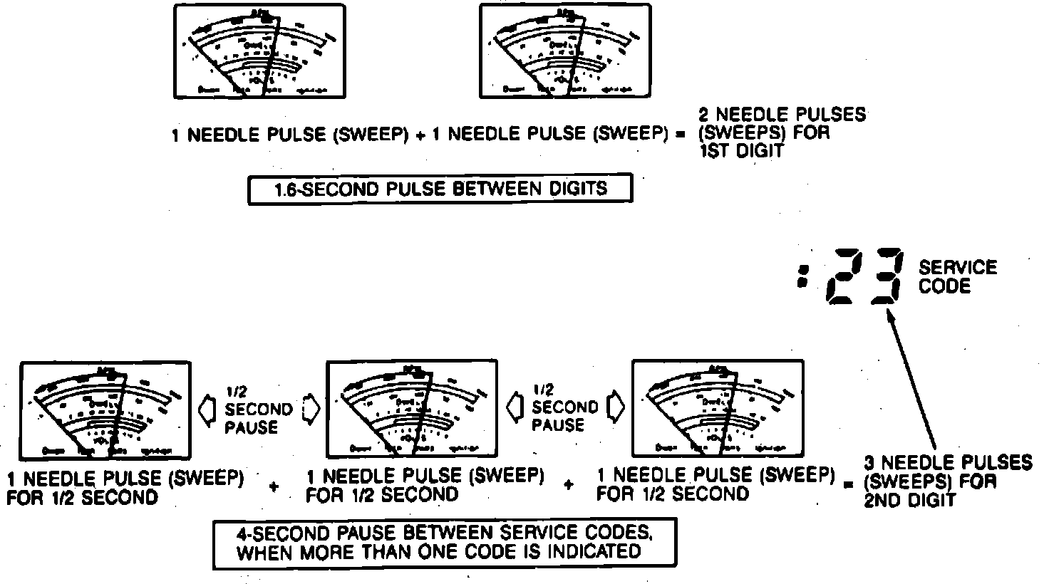 As previously stated, a service code is sometimes represented by a two digit number, such as 23. As a result, the self-test service code of 23 will appear on the voltmeter as two needle pulses (sweeps) then, after an approximately 1.6 second pause, the needle will pulse (sweep) three times. The continuous memory codes are not separated from the Key-On/Engine-Off codes. They are produced on the voltmeter in the same manner as the Key-On/Engine-Off codes.
