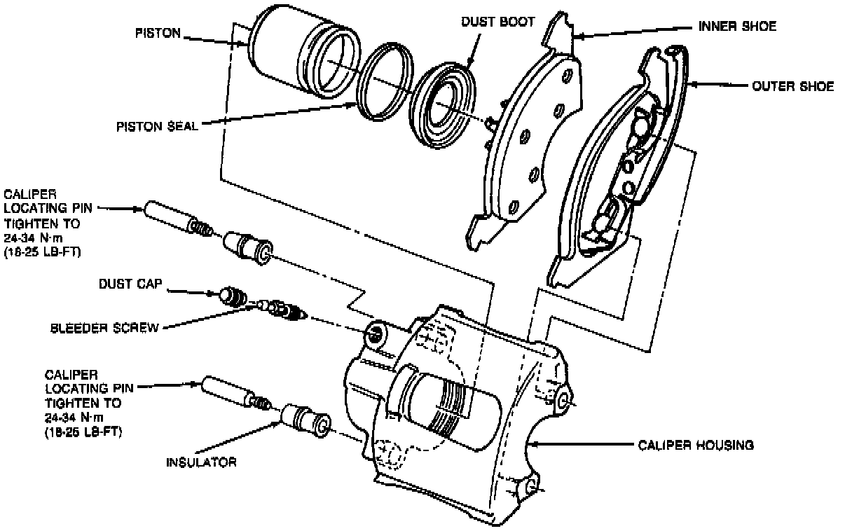 1. Use a 4-inch C-clamp and wood block 70mm x 25mm (2-3/4 inch x 1-inch) and approximately 19mm (3/4 inch) thick to seat caliper hydraulic piston in its bore. This must be done to provide clearance for caliper assembly to fit over rotor during installation.