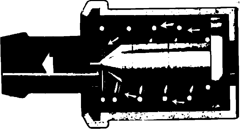 The PCV valve, Fig. 56, consists of a needle valve, spring and housing. When the engine is off, the spring holds the needle valve closed to stop vapors from entering the intake manifold. When the engine is running, manifold vacuum unseats the valve allowing crankcase vapors to enter the intake manifold. In case of a backfire in the intake manifold the valve closes, stopping the backflow and preventing ignition of fumes in the crankcase. During certain engine conditions, more blow-by gases are created than the ventilator valve can handle. The excess is returned through the air intake tube to the air cleaner and carburetor where it is burned in the engine.