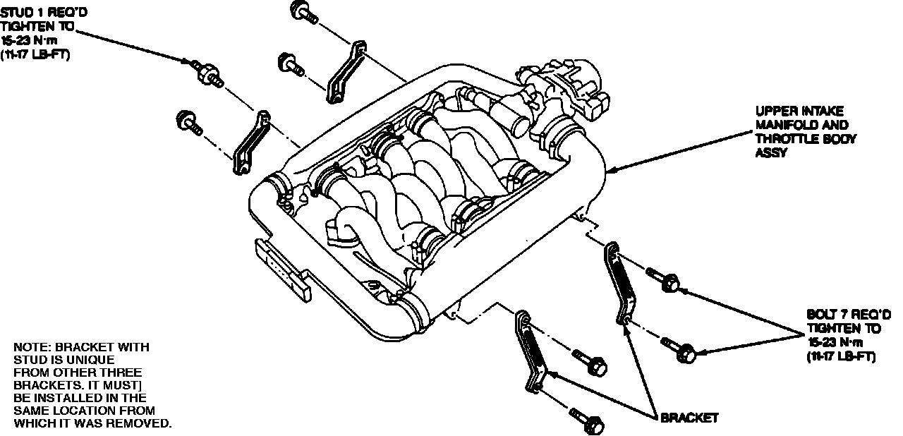6. Install manifold support brackets and coolant hose bracket. Tighten bolts to 11-17 lb. ft. (15-23 N-m)