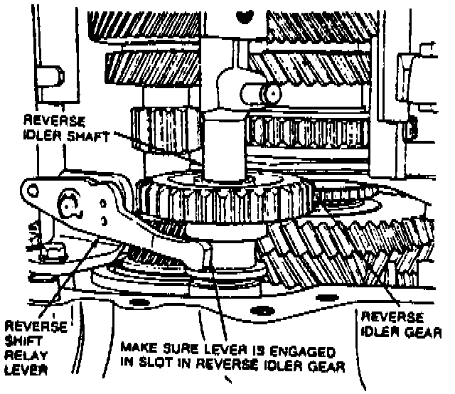 11. Install reverse idler gear on clutch housing, then align reverse shift relay lever to the slot in the gear and slide reverse idler shaft through the gear and into its bore.