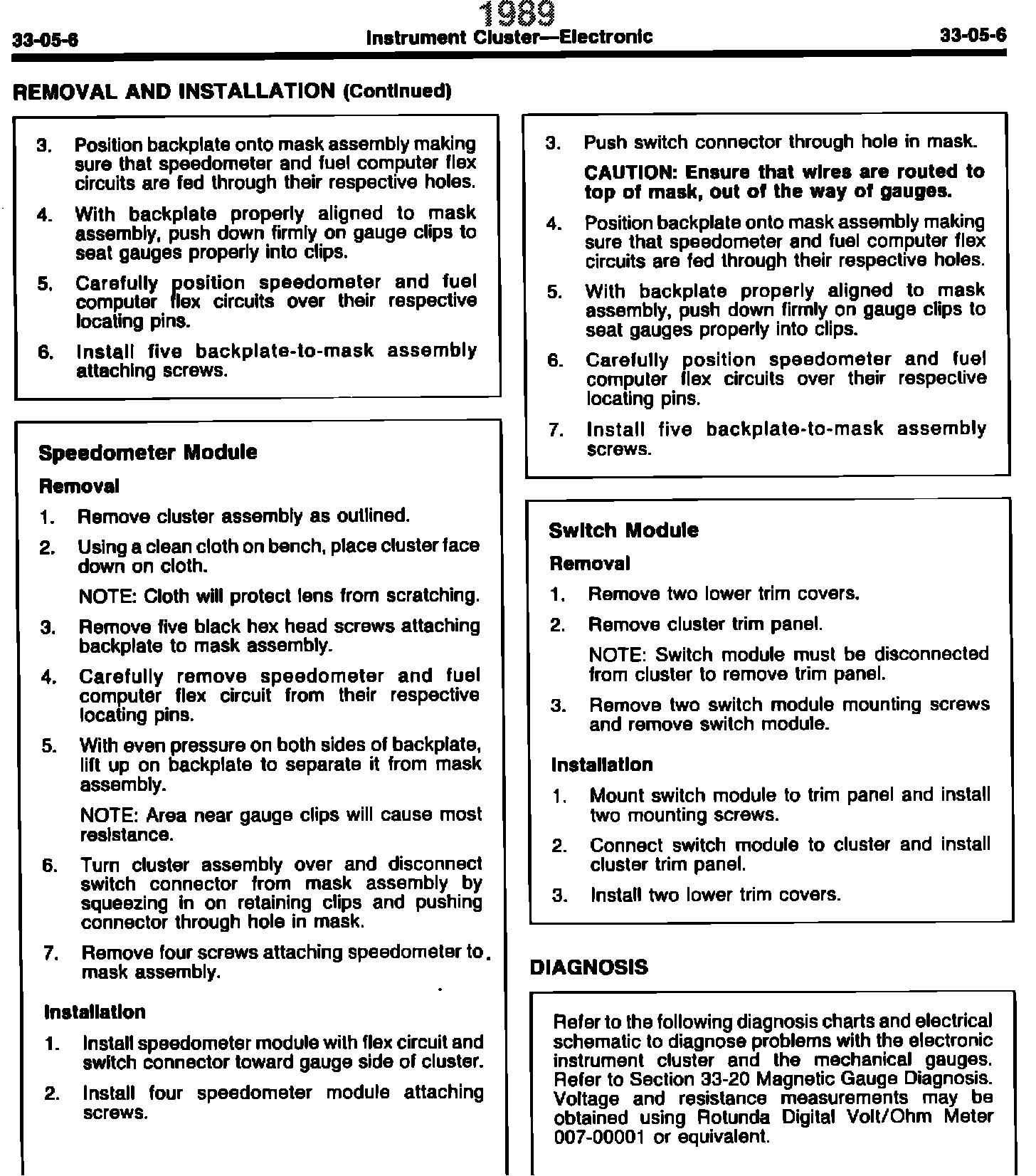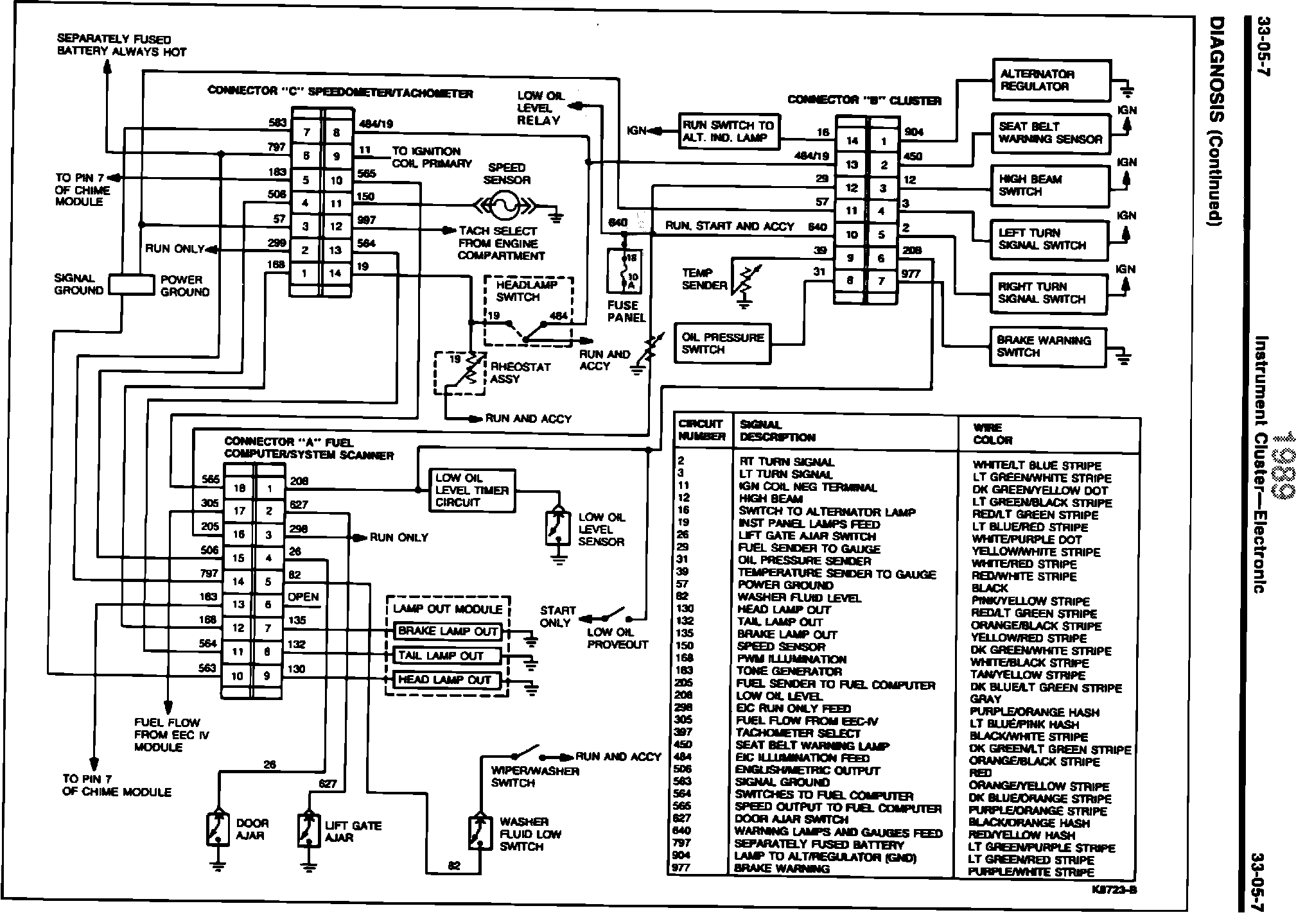 ISSUE: The Electronic Instrument Cluster schematic on page 33-05-7 of the 1989 EVTM has been revised. The Low Oil Level Relay and Fuse Panel circuit have been added.