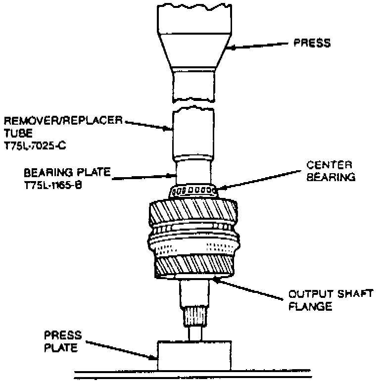 1. Position output shaft so rear end faces upward. Lubricate all bearing journals. Install the following parts in the order listed, using bearing replacer tool No. T53T-4621-B and bearing plate tool No. T75L-1165-B or equivalent.