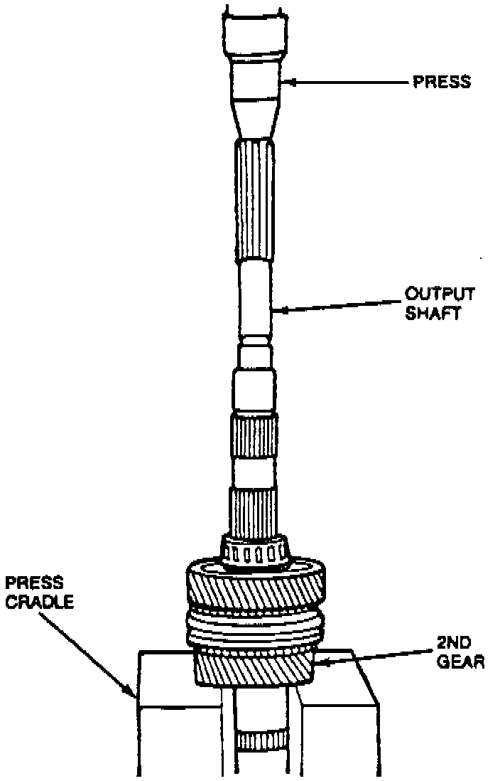 6. Position output shaft with rear end (long side of flange) facing upward. Place output shaft into press with press cradle contacting lower part of second gear. Ensure that output shaft flange does not contact or ride up onto press cradle, as improper positioning of output shaft can cause component damage.