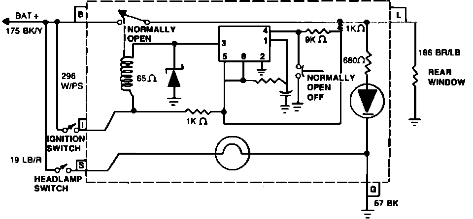 As soon as the switch is depressed to the ON position, it electrically connects power to energize the timer relay coil, thereby causing the normally open relay load contacts to close and provide power to the ON lamp and the rear window grid wires. The grid wires will continue to receive power for approximately ten minutes.