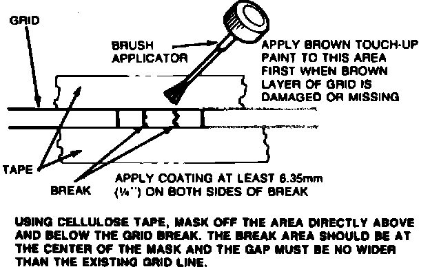 3. If both brown and silber layers of grid are broken or missing, apply a coating of the brown touchup paint across break area first. Two coats may be necessary to obtain proper color. Allow touch-up paint to dry, then apply three coats of silver grid repair compound, allowing three to five minutes drying time between coats. The coating of silver grid repair compound should extend at least 6.35 mm (1/4 inch) on both sides of break area.