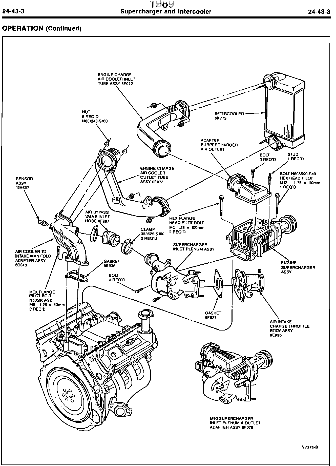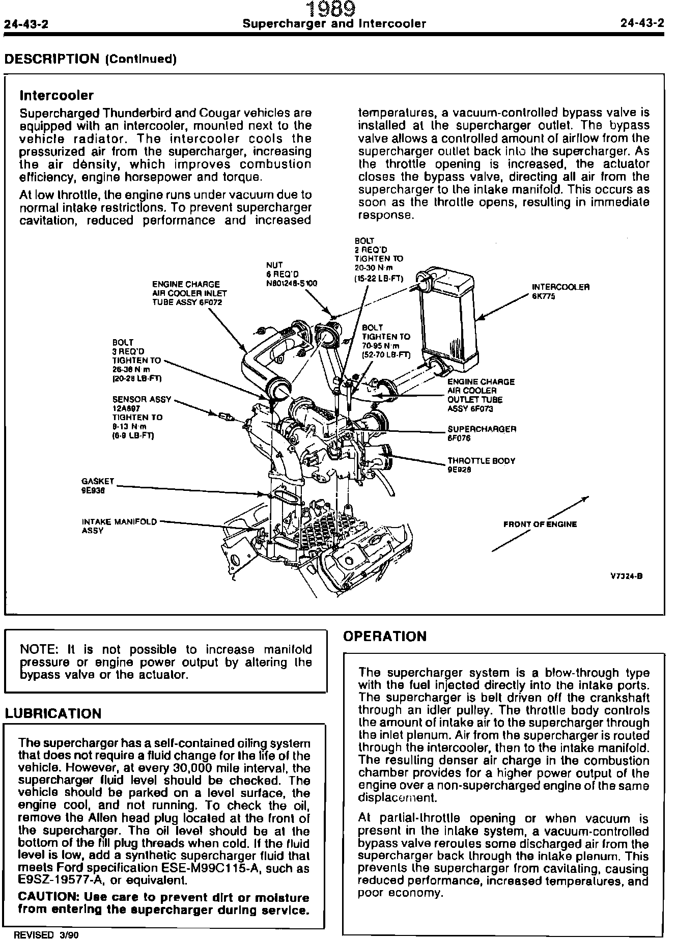 90ford15^ SHOP MANUAL - 1989 - PAGE 24-43-2 - ILLUSTRATION REVISED TO INCLUDE INTERCOOLER AND RELATED COMPONENTS