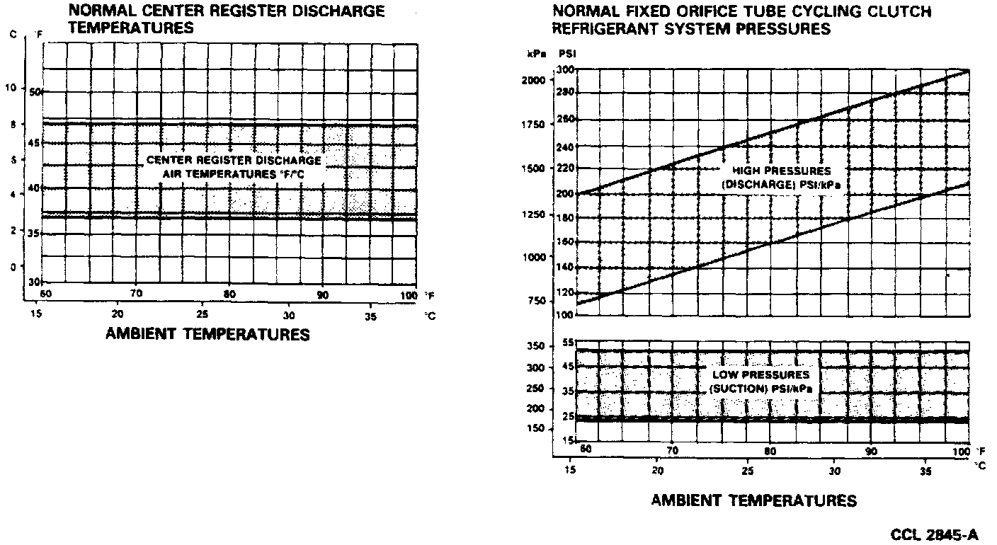 NOTE: If the point where the two lines cross on each of the charts falls within the shaded band, the system is operating normally. If the lines cross outside the shaded band on one or more of the charts, there is a problem and the specific cause must be determined. This is easily done by using the Refrigerant System and Clutch Cycle Timing Evaluation chart.