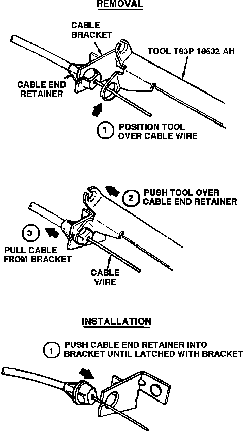 1. Move mode selector lever to the MAX A/C position. Using control cable removal tool T83P-18532-AH, Fig. 14, disconnect the air inlet cable housing end retainer from A/C case bracket, then disconnect cable from inlet door cam.