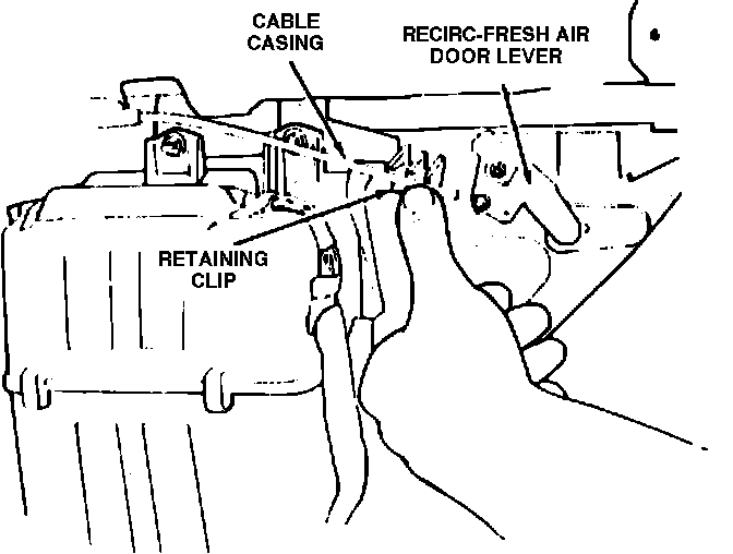 4. Remove retaining clip and disconnect recirc/fresh air door cable from door operating box opening, Fig. 15.