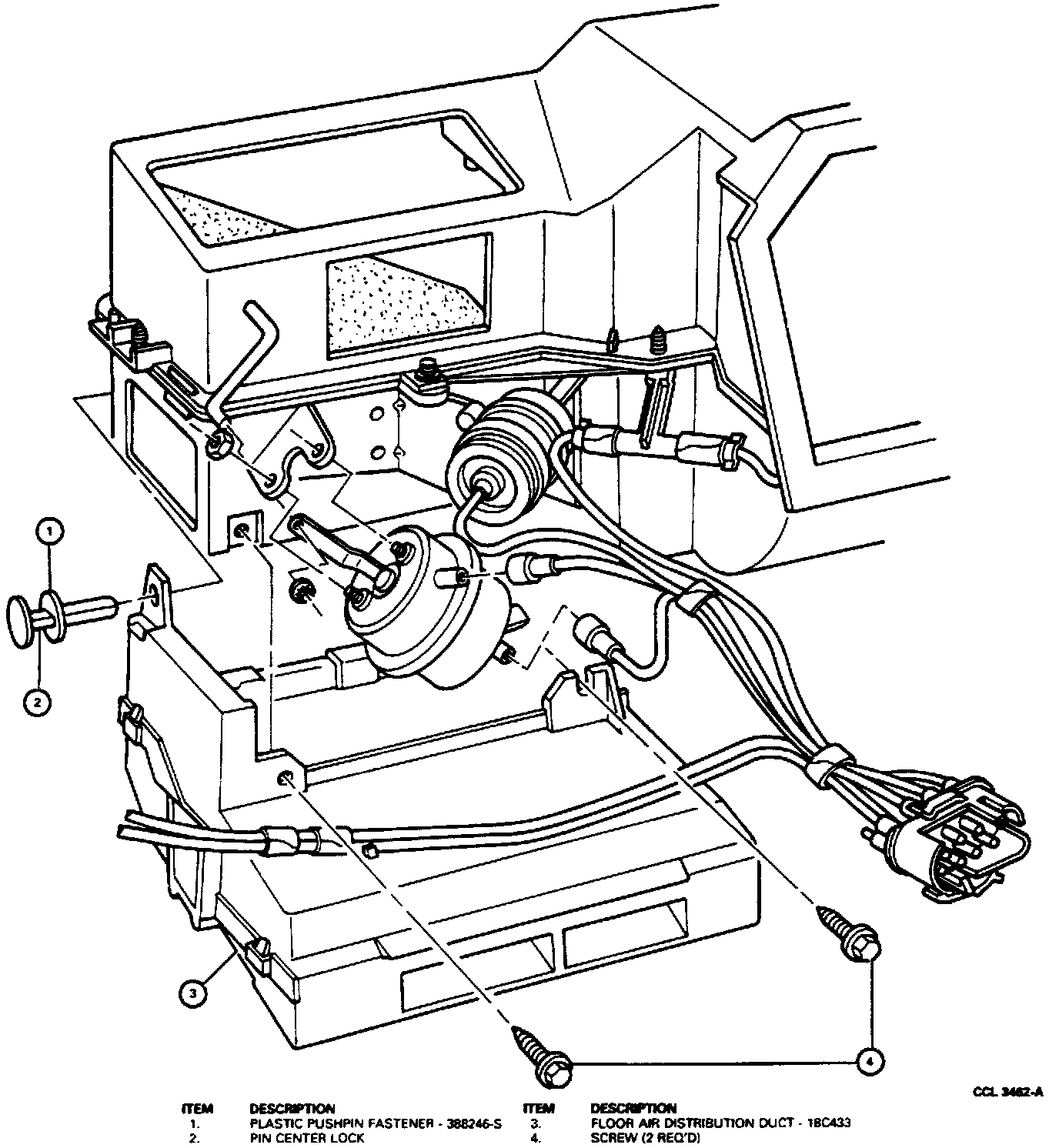 4. Install the LH and the RH screws that attach the rear of the floor air distribution duct to the plenum. If necessary tighten the screws attaching the partial (lower) panel door vacuum motor to the mounting bracket.