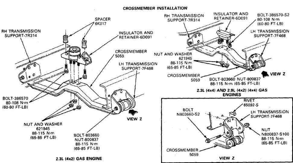 11. Raise the transmission. Position the crossmember, insulator and support and damper to the frame side supports and install the attaching bolts.