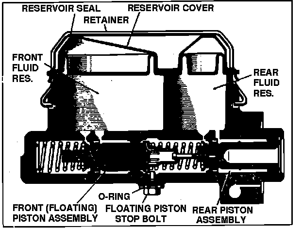 Should the front (primary) brake system fail, initial brake pedal movement causes the unrestricted primary piston to bottom out against the secondary piston. Continued downward movement of the brake pedal moves the secondary piston to displace hydraulic fluid in the rear brake system to actuate the rear brakes.