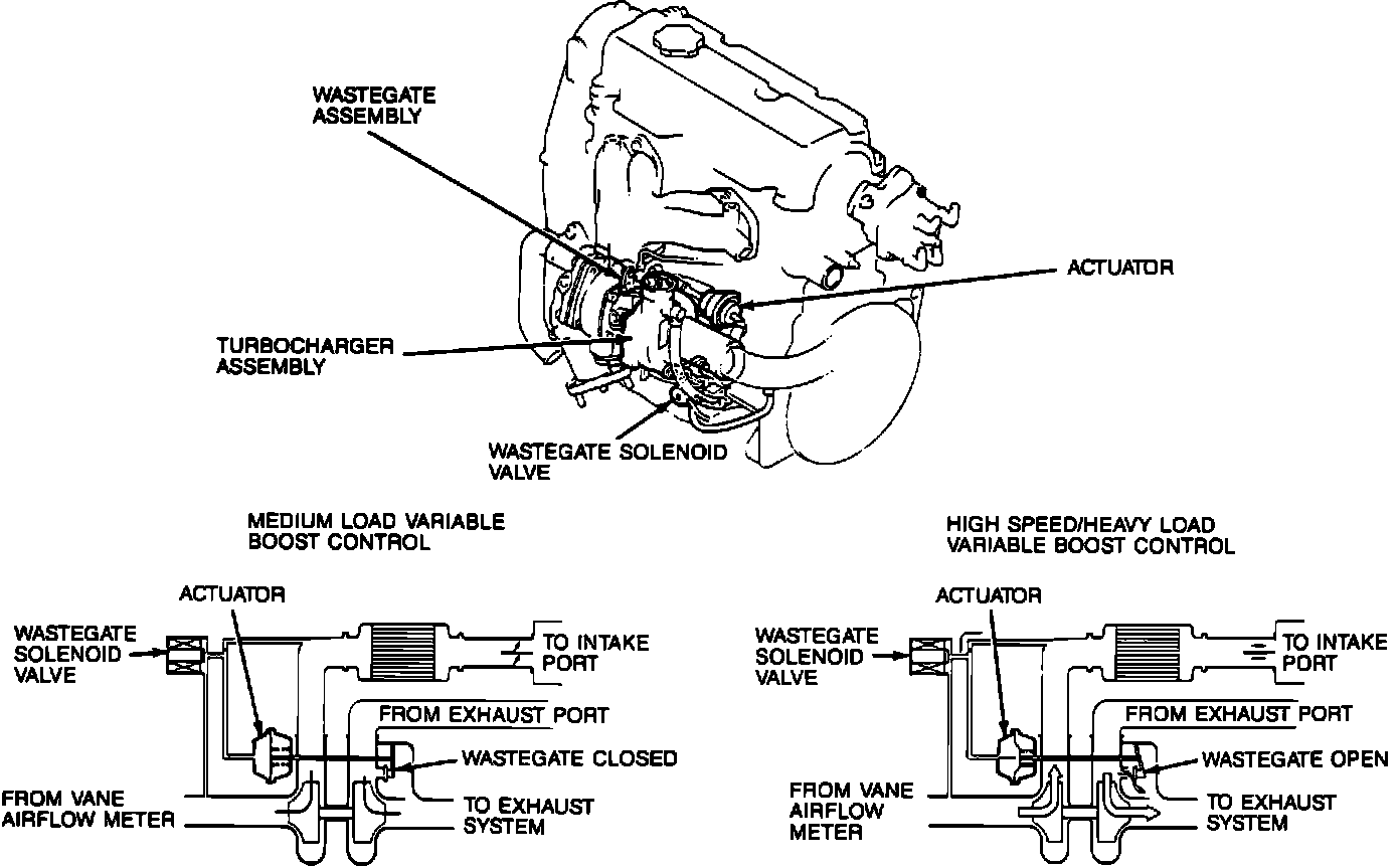 Under medium load conditions the amount of exhaust gas increases and intake air is pressurized. The wastegate remains closed at this time because intake air pressure is not great enough to overcome the actuator spring constant of 5.4 N-m (48 lb. in.).